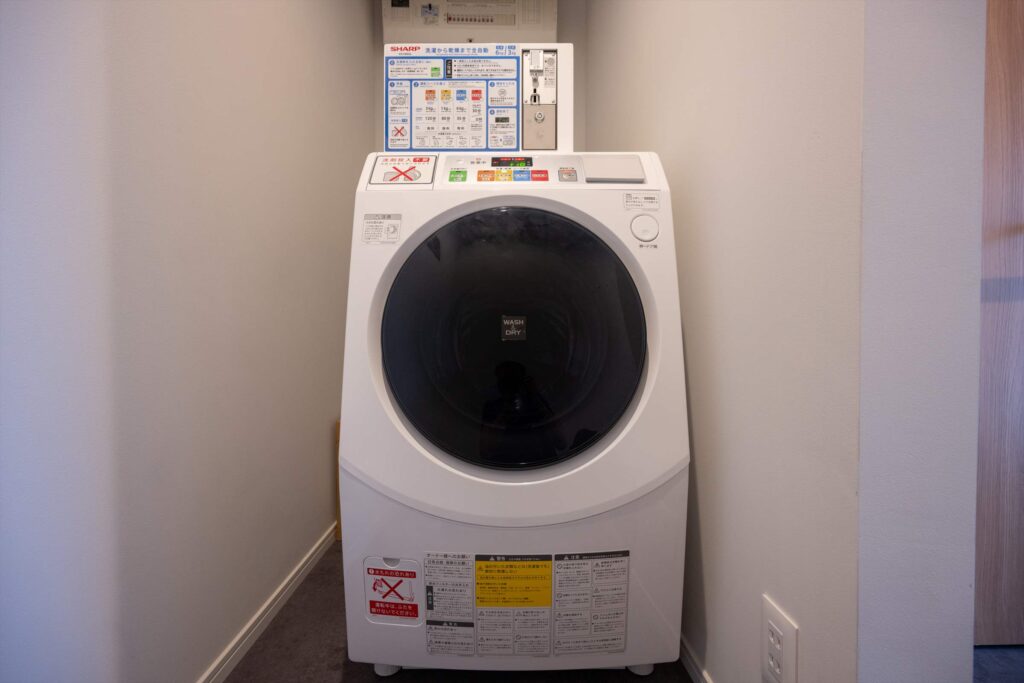 1階貸切専用風呂の手前にランドリールームがございます。 洗濯乾燥機を無料で24時間ご利用可能です。スマートフォンからリアルタイムのご利用状況をご確認いただけます。