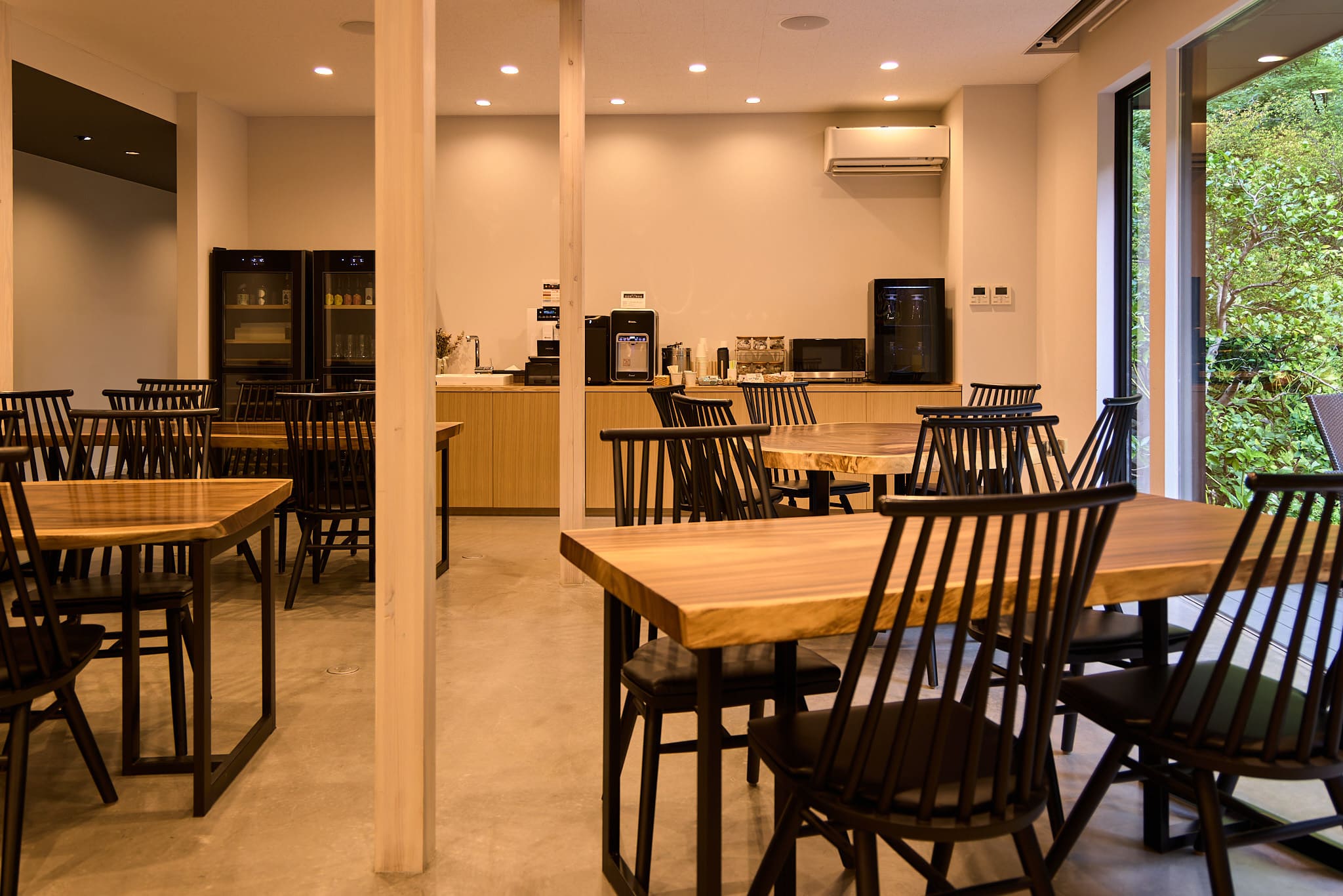 1階ダイニングは大きな窓から差し込む柔らかい光や目の前に広がる庭園を眺めながら、お食事やお飲み物をお楽しみいただけます。