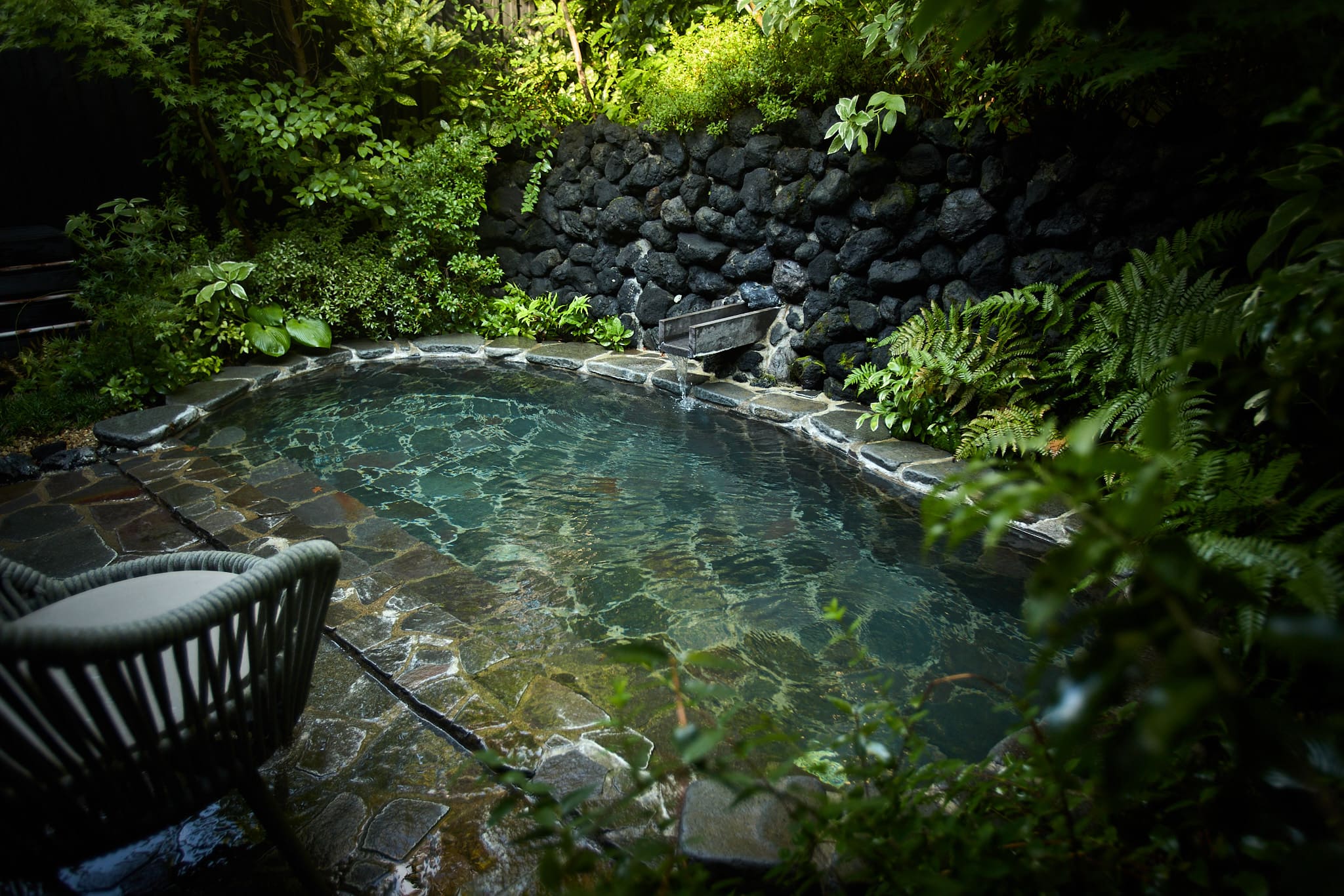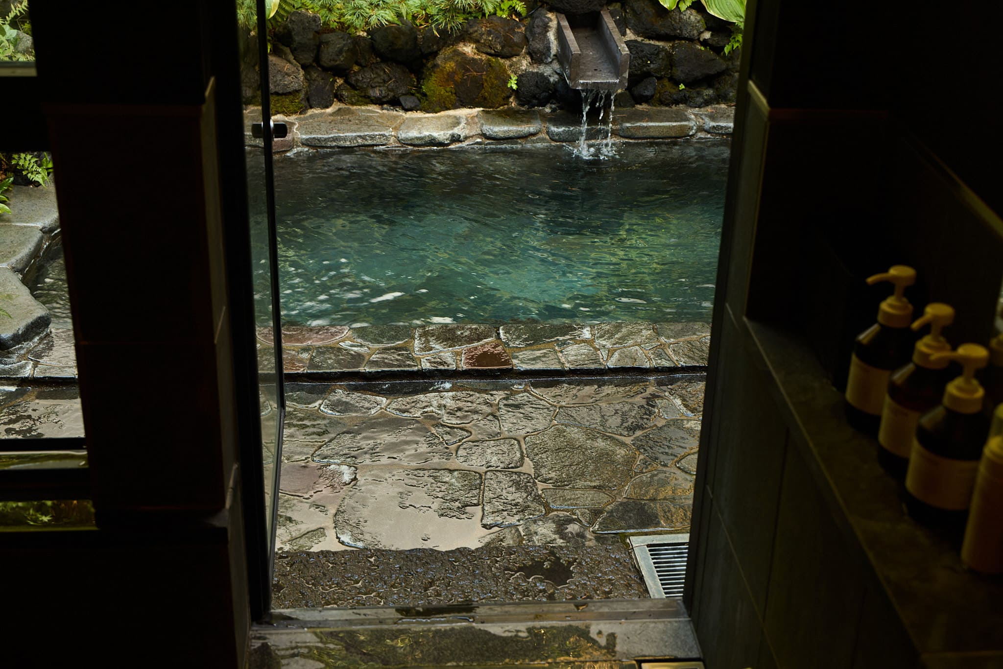 「山水の湯」は、1階ダイニングを背にし、貸切専用風呂エリアの2番目にございます。内風呂、露天風呂から庭園をお楽しみいただけます。翌朝11:00まで一晩中ご利用いただけます。