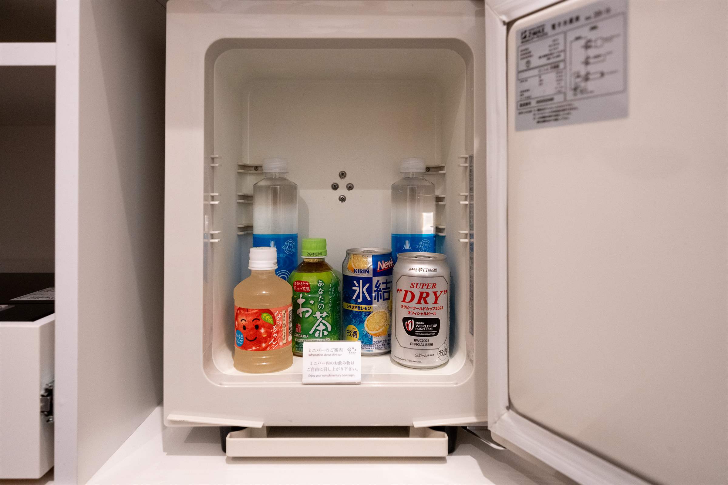 お部屋の冷蔵庫には、あらかじめ無料のお飲み物をご用意しております。通常のセット内容は ミネラルウォーター 、ソフトドリンク、ビール(缶) 、サワー(缶)となります。