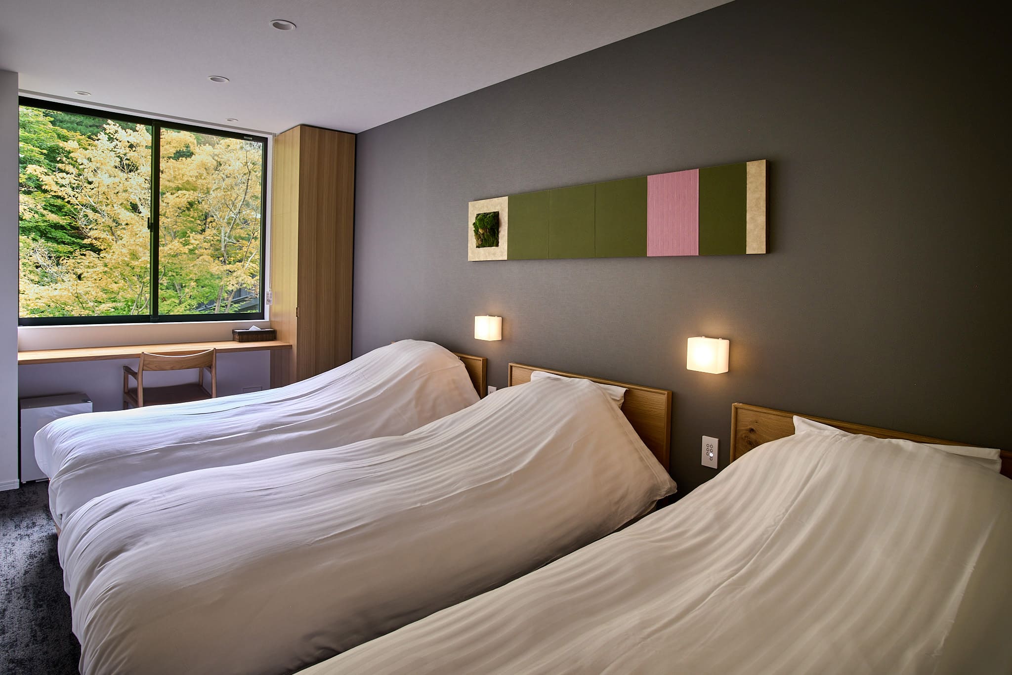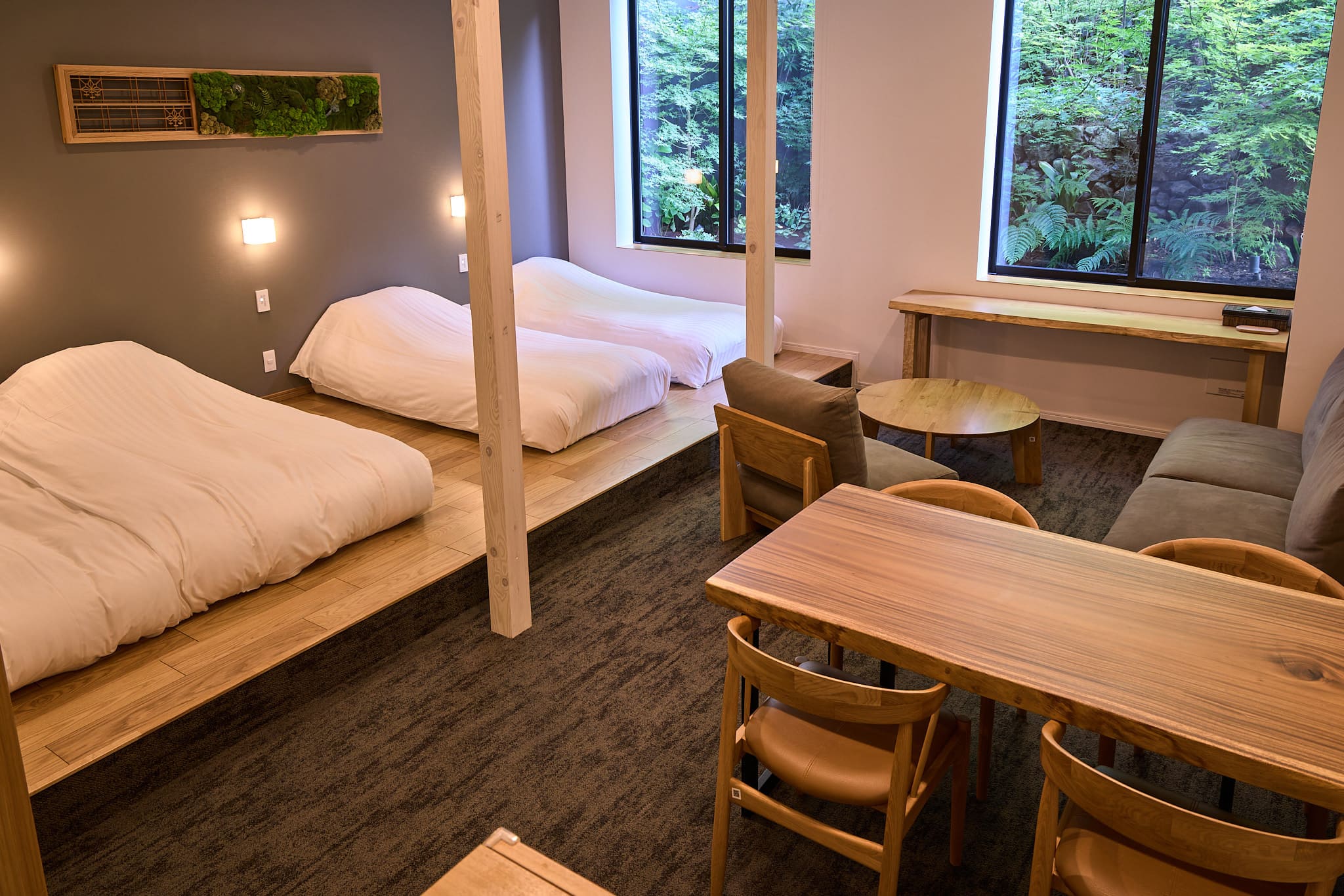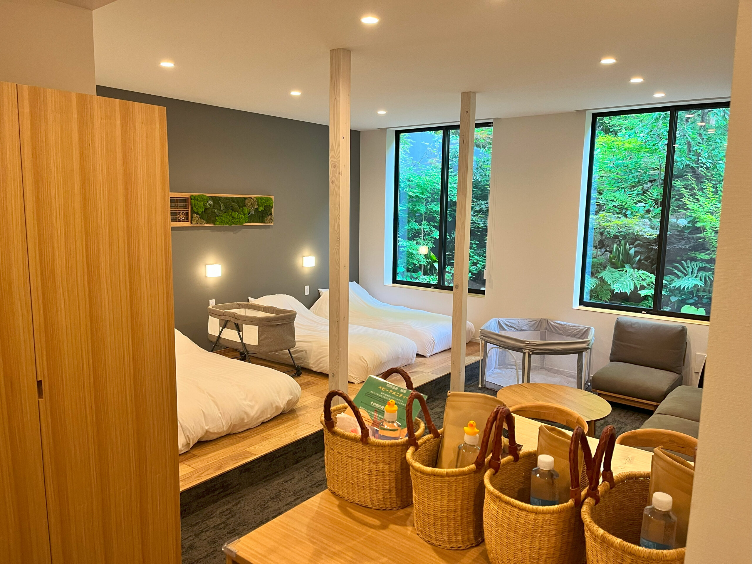 1階デラックスルームは、石原和幸プロデュースの庭園が目の前に広がるお部屋です。四季の移り変わりを心ゆくまでお楽しみいただけます。シングルベッド3台、ローベッドのお部屋です。ベッドを寄せて親子で並んで就寝することも可能です。脚の高いベッドが不安なお子さまや、赤ちゃん連れも安心してご利用いただけます。