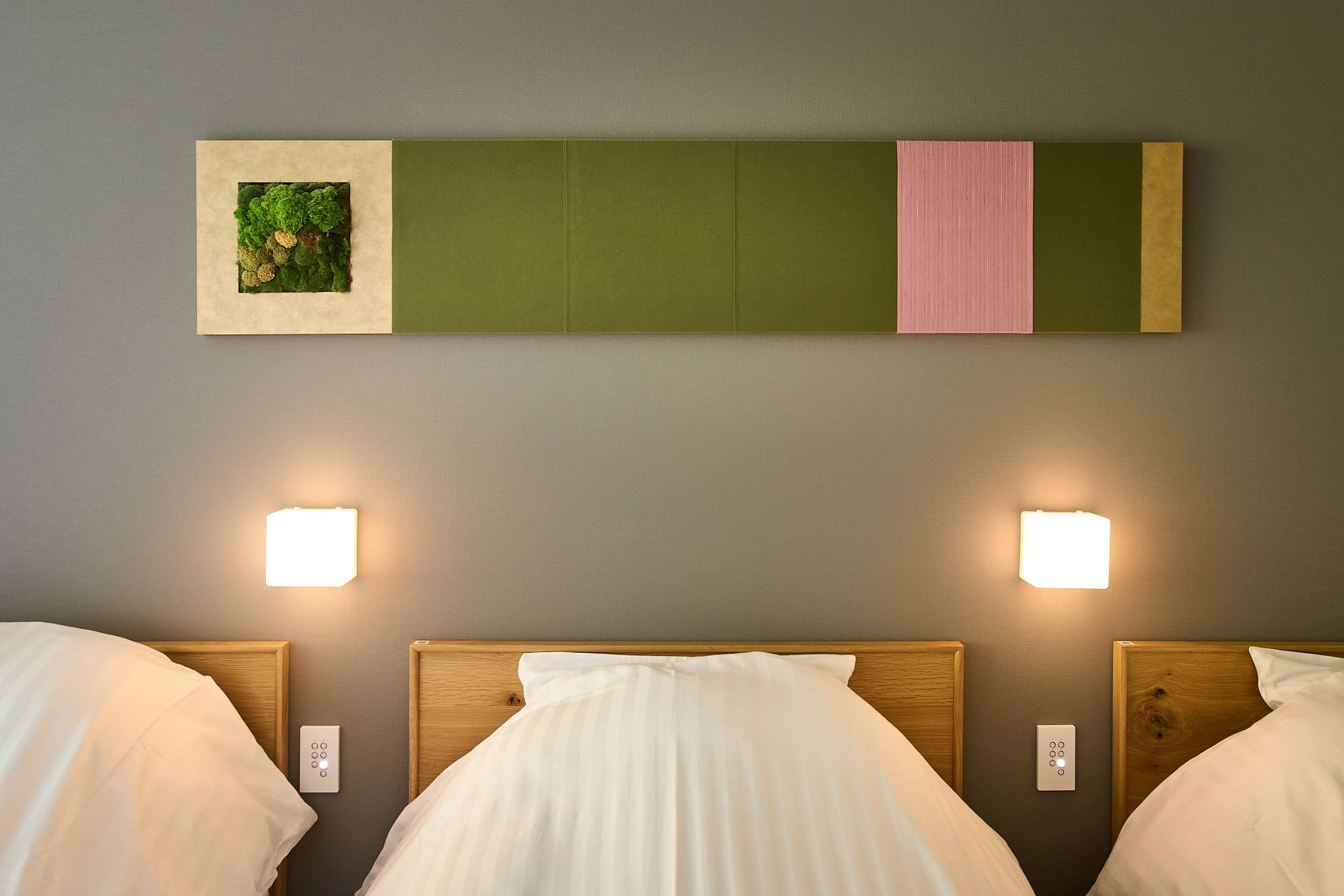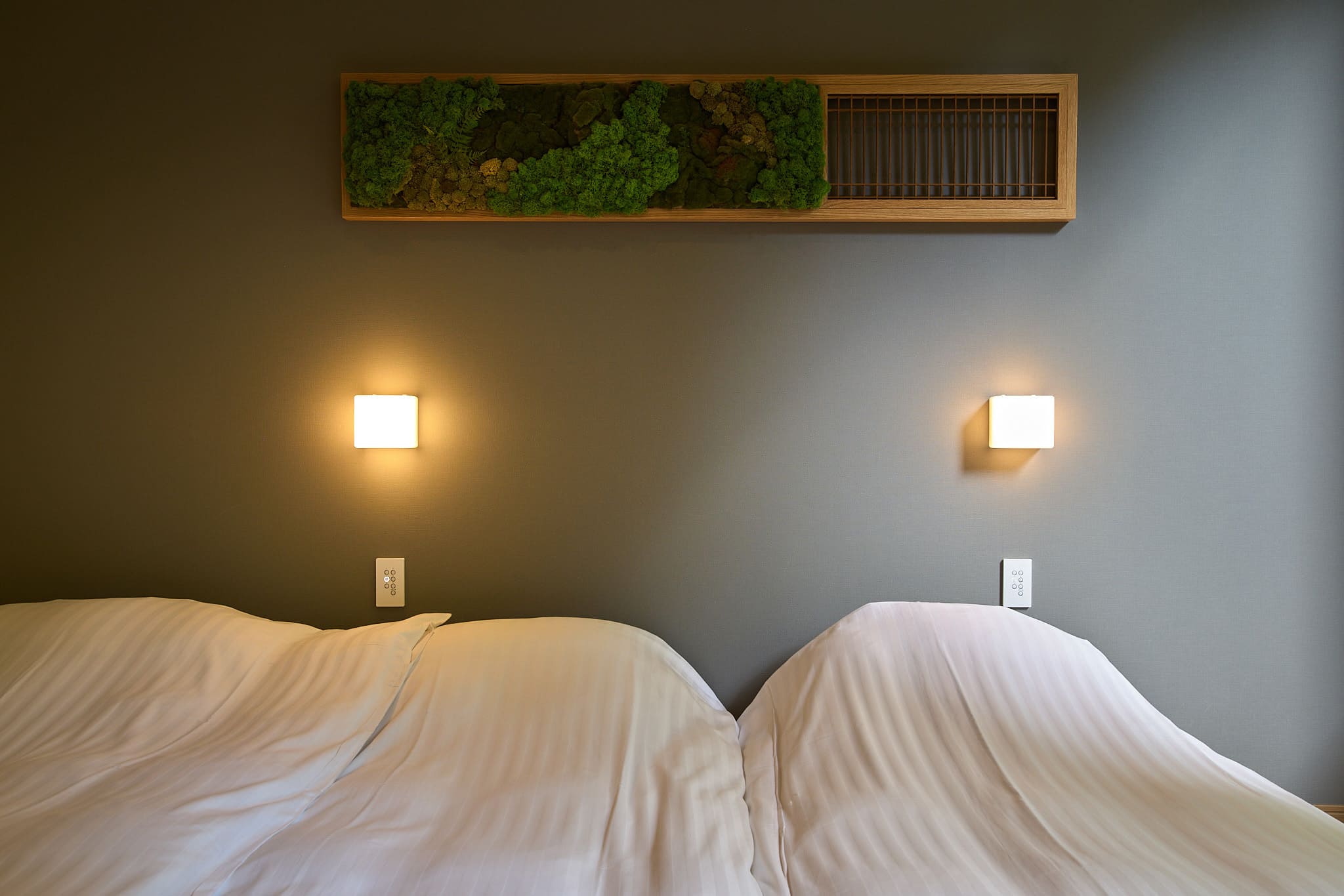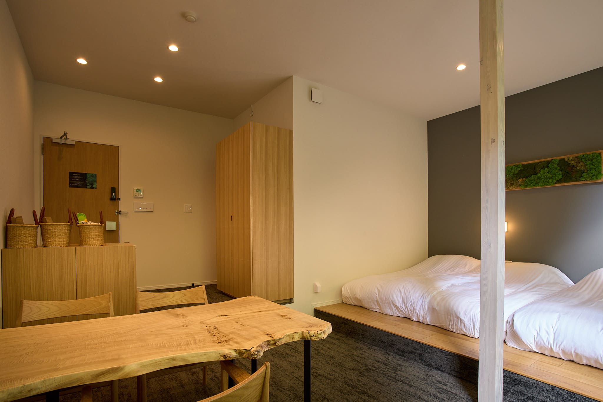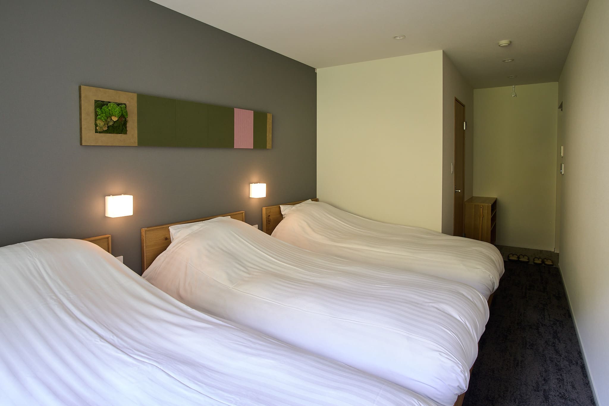 1階デラックスルームは、石原和幸プロデュースの庭園が目の前に広がるお部屋です。四季の移り変わりを心ゆくまでお楽しみいただけます。シングルベッド3台、ローベッドのお部屋です。ベッドを寄せて親子で並んで就寝することも可能です。脚の高いベッドが不安なお子さまや、赤ちゃん連れも安心してご利用いただけます。