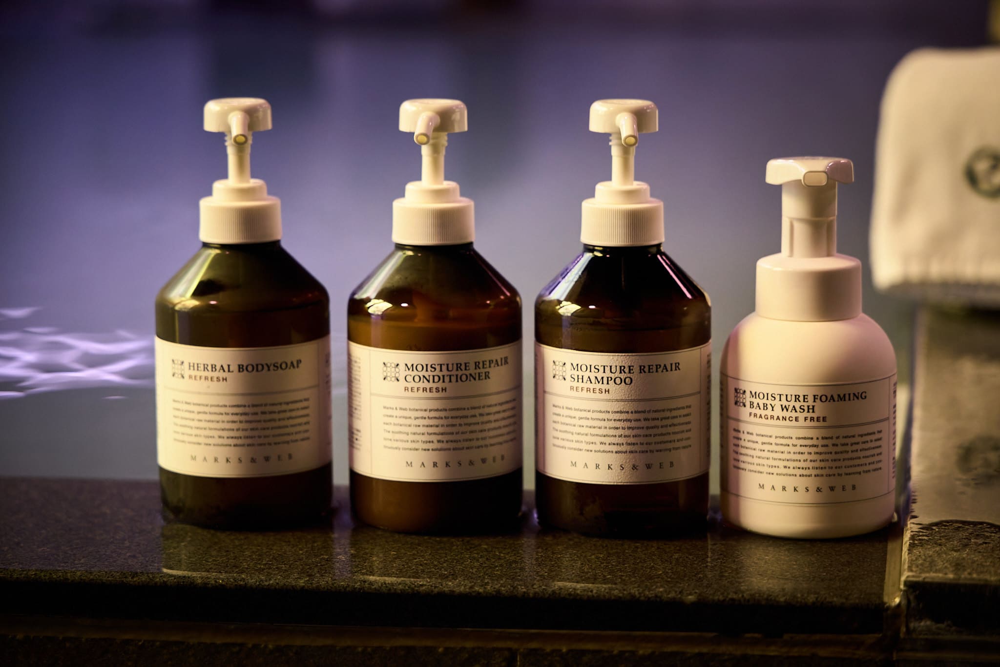 お部屋に「MARKS&WEB」のシャンプー、コンディショナー、ボディーソープを始め、化粧水・乳液等をご用意しております。大浴場なども含め全館「MARKS&WEB」を設置しております。