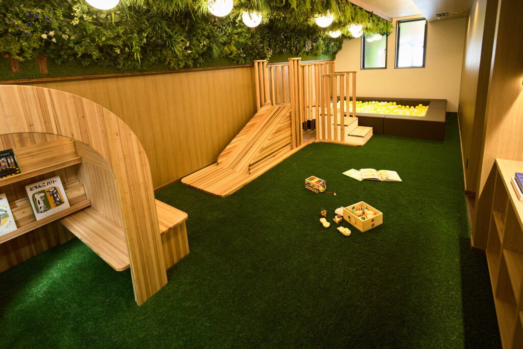 緑や木の温もりあふれるキッズルームにはボールプールや滑り台を設置。絵本やゲームがいっぱい。