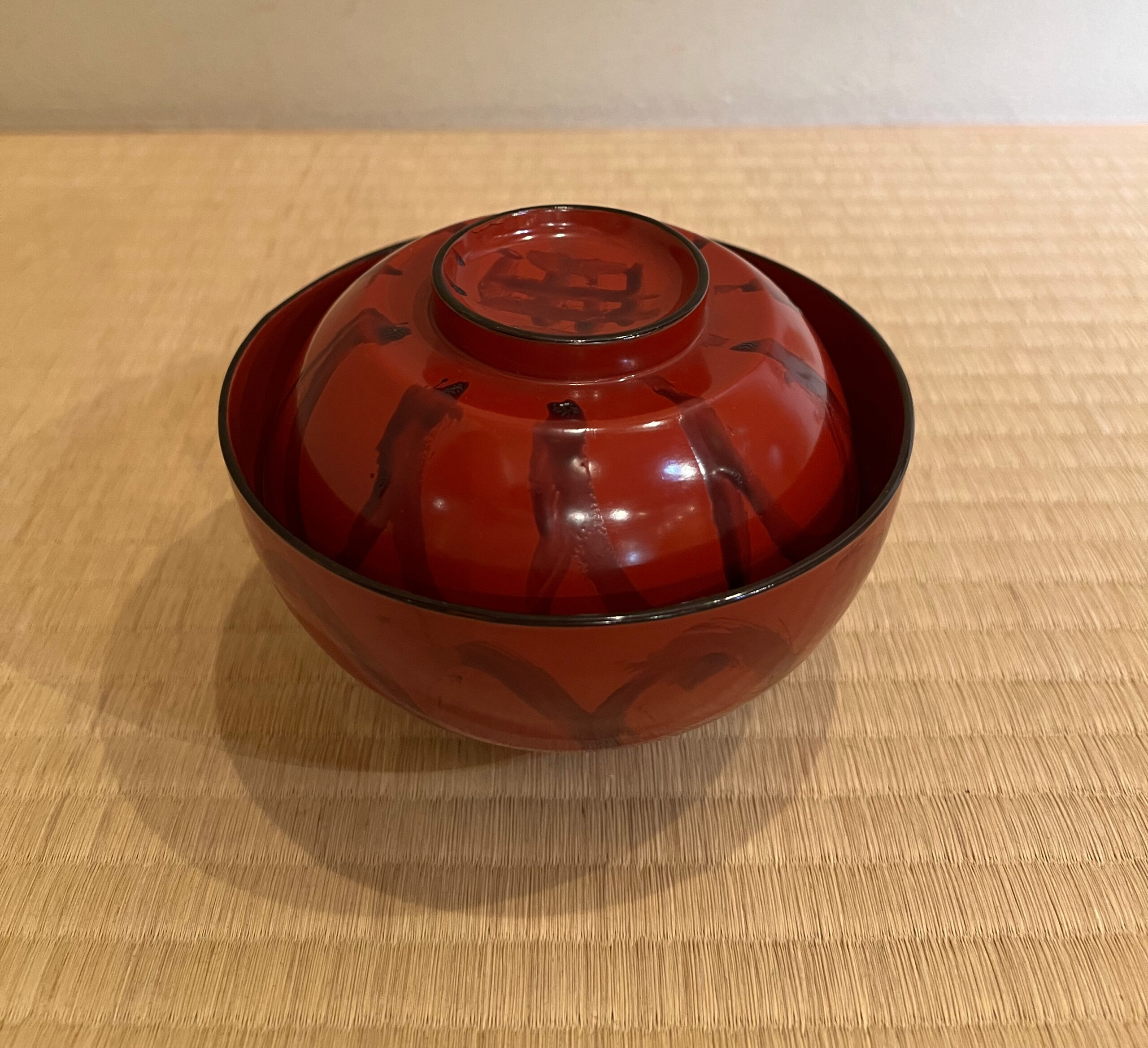 本作品は菊文の御膳とともに伝わったお椀です。お椀(煮物椀)は懐石料理や茶事の中でも最も重要なものとなっています。魯山人先生は戦時中、窯から火が出せないこともあり石川県山中や富山県の城端塗など漆の作品を多く制作しました。お椀の蓋の摘みの中を芯と言いますが、その部分には菊の筒状花(中央の部分)を簡略に描いたと思われ、それ以外の蓋の部分と身の部分には花弁が描かれている。本作品は昭和30年頃の作品です。