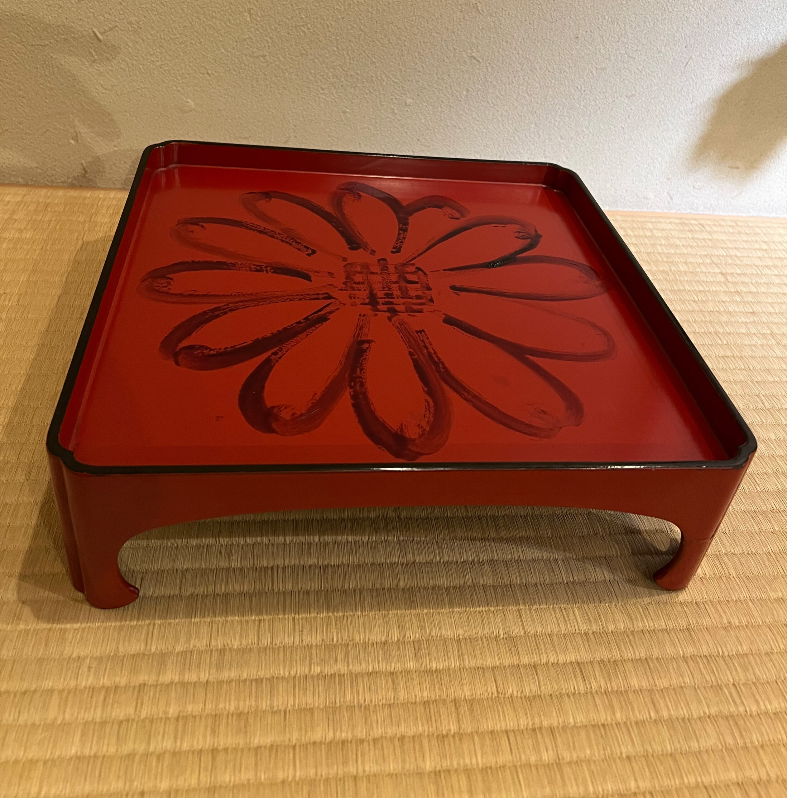 本作品は菊椀とともに伝わったもので朱塗の御膳の中央に大きな菊を描いています。菊は不老長寿の意味をもち古来より好まれて用いられてきました。この形は宗和膳という形といい、折敷が足付膳に江戸時代から使われるようになったと言われています。向付と飯碗、汁椀をのせて茶事や懐石などで使っていただいたり、色とりどりの酒器などをのせても楽しめます。趣向で展示用の台としても展開ができると思います。昭和20年~30年頃の作品の作品です。