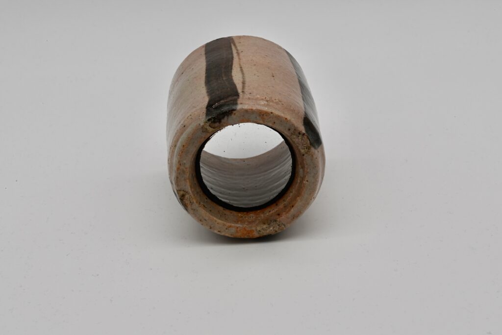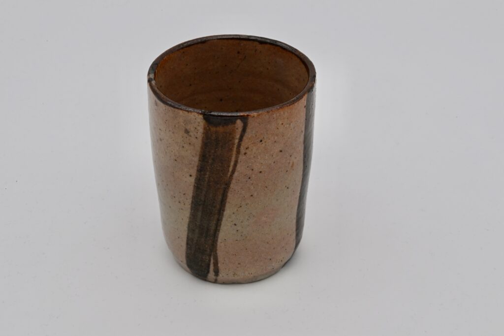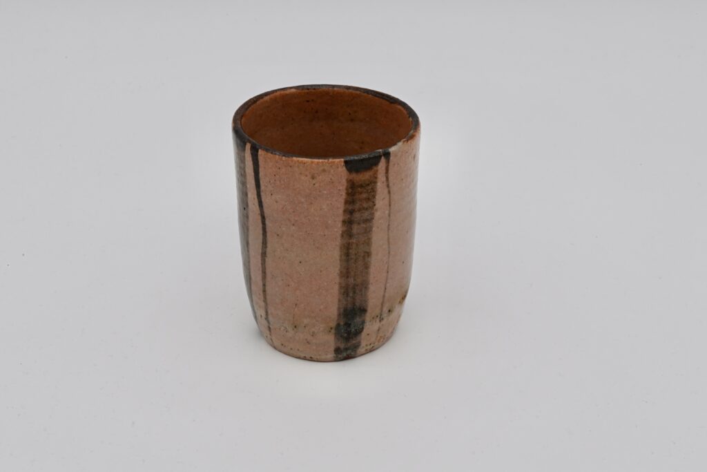 魯山人先生はビールを大変好み、いつもサッポロの瓶ビールの小瓶を愛好されていたようです。志野作品に大きな手付の麦酒呑があります。またちょうど湯呑の大きさでは染付の蛍手のビール呑があり、本作品と同じように底部にガラスを入れてビールを楽しませる作品となっています。ガラスを入れることにより清涼感が増しています。やや桃色を呈した御本手のような素地に鉄絵の太い線と細い線が配されています。こうした一本の線も大芸術家である魯山人先生ならでは美しい線です。晩年の作品です。