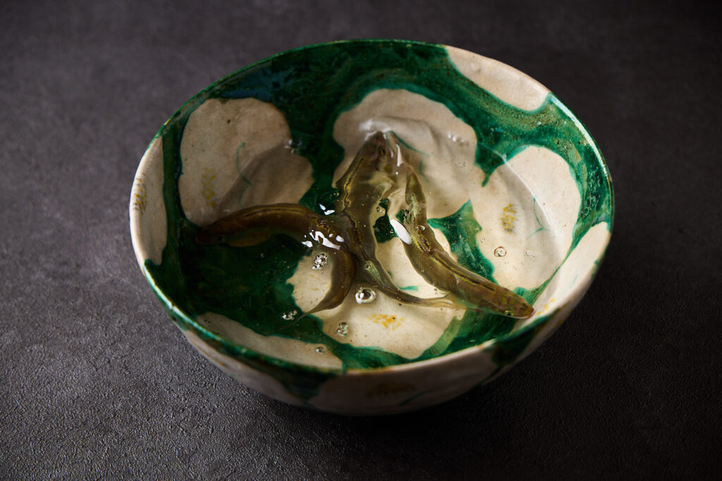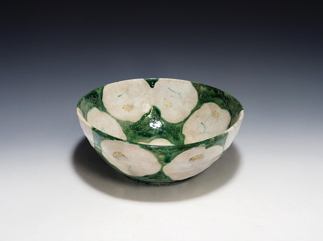 色絵紅白椿の鉢がとても人気が有りますが、この緑釉の椿鉢は大変珍しく今まで図録にも載らず見たこともありません。花の分かれ目やおしべなどもちゃんと描かれ、大振りな鉢の周りと見込みいっぱいに椿が有ります。緑釉も均一では無くメリハリのある面白味が出ています。使い勝手も良さそうで、そのままテーブル席に置いても、果実を散らしても、酒をはっても、水をただ入れてもその他色々と使えそうです。大事にしたい、緑釉の椿鉢名作ではないでしょうか。昭和15年(1940)頃の作品