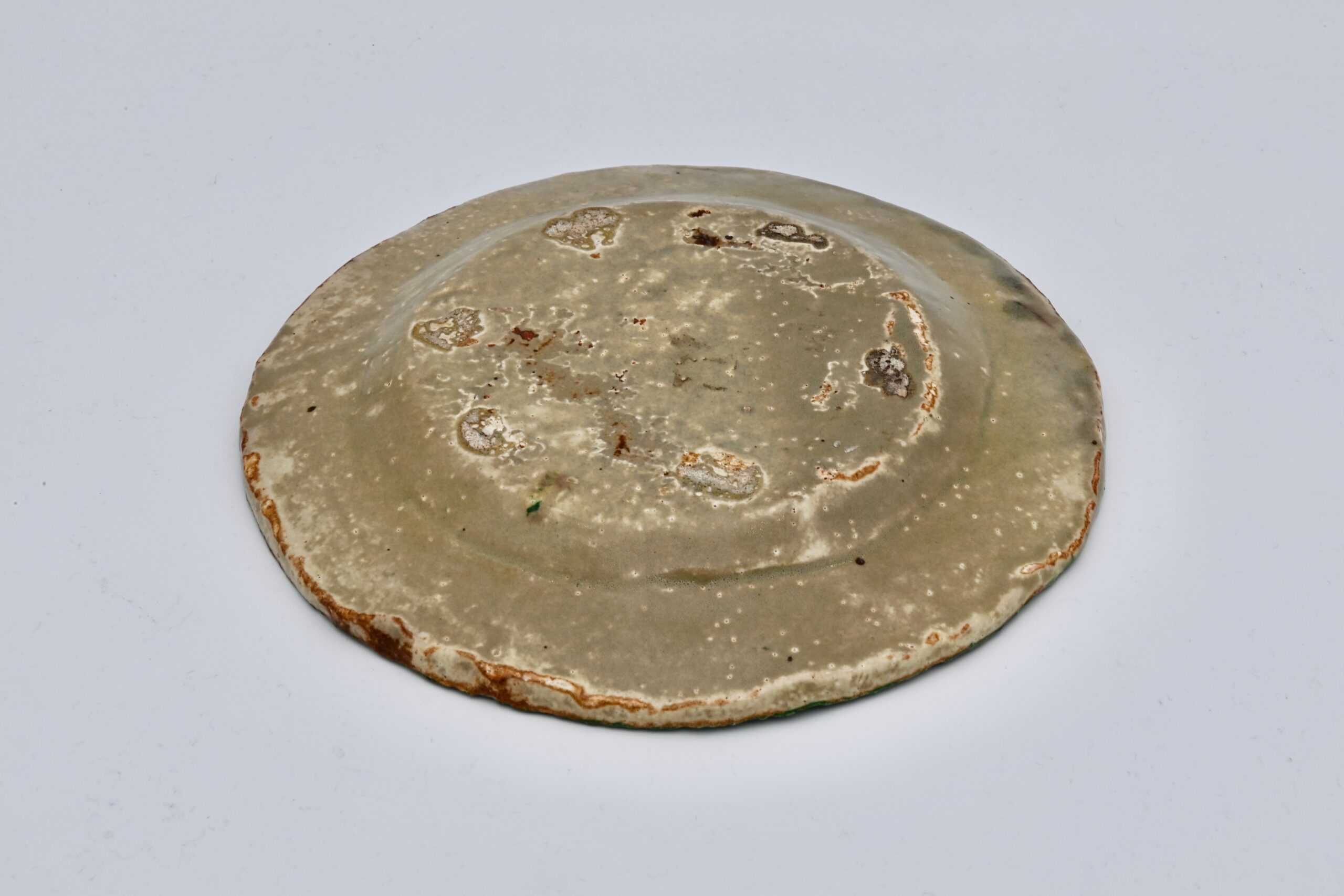 窯場の松島主任が去り、自ら土を叩いて形成した大振りな平鉢に御本手のような白い釉をかけ、淵に緑の絵を厚く描きそこから垂れたように赤、黄、緑の滴を不規則に魯山人らしく描いた、魯山人しか出来ないデザイン雰囲気を出した、心を込めた作品です。皿立や額に納めて飾っても映え、食器として何を乗せても好く合い、存在感があり、見ただけで魯山人を思わせる平鉢です。滅多に無い心躍らされる名品です。昭和30年(1955)頃の作品