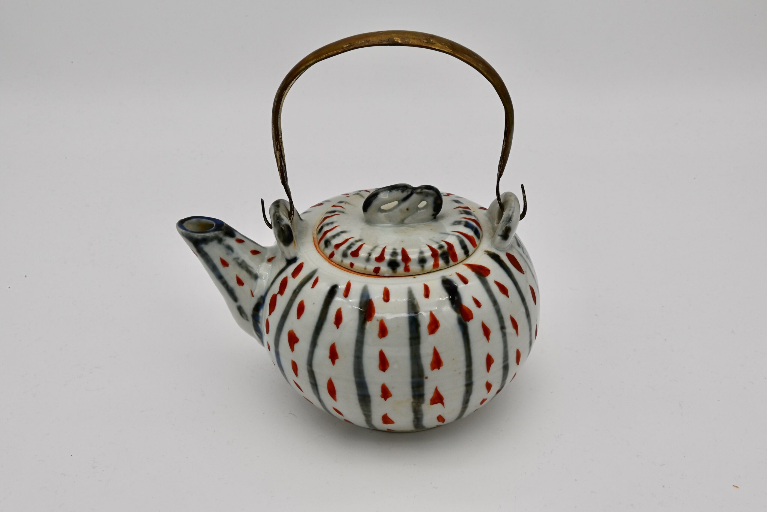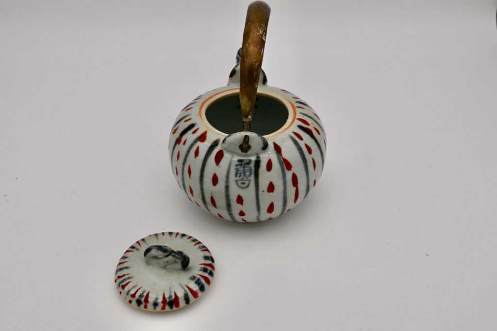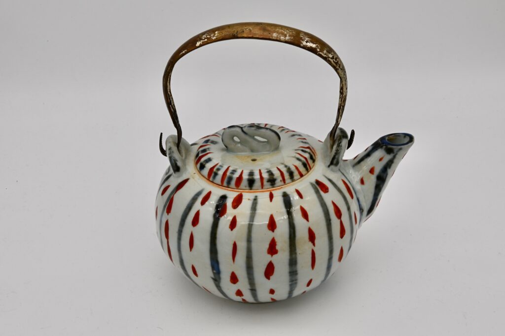 昭和初期に制作された土瓶で、赤絵と染付による水玉文が特徴的な一品。赤絵と染付の組み合わせは、魯山人が得意とした技法のひとつであり、伝統的な様式に遊び心を加えた意匠となっている。水玉文は単純ながらも動きを感じさせ、魯山人らしい洒脱なデザインセンスが光る。土瓶の形状は実用性を重視しつつも、美的なバランスが考慮されており、日常の器としての魅力を備えている作品。
