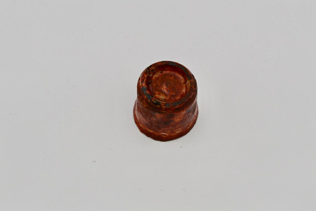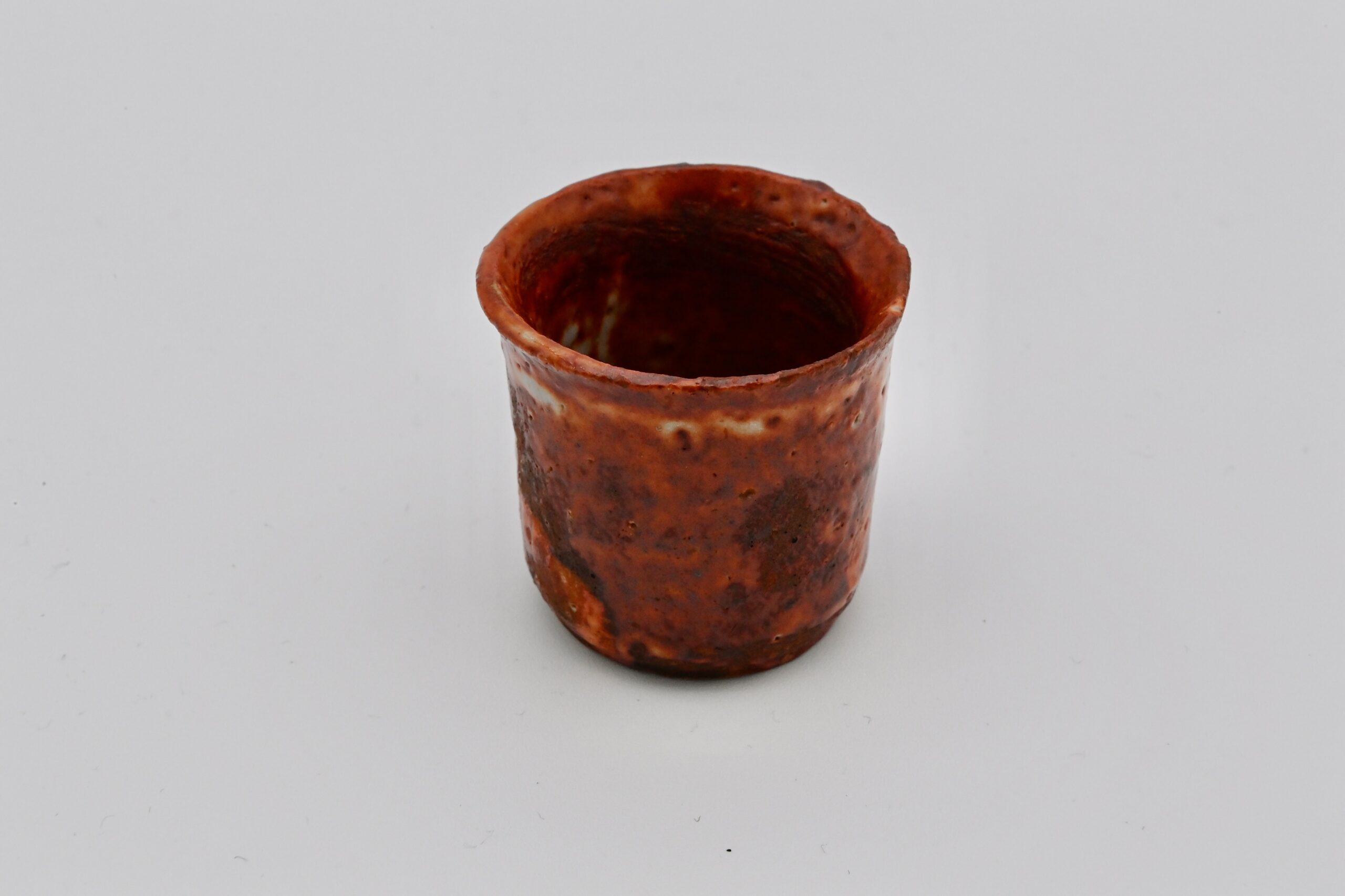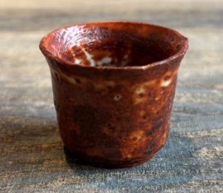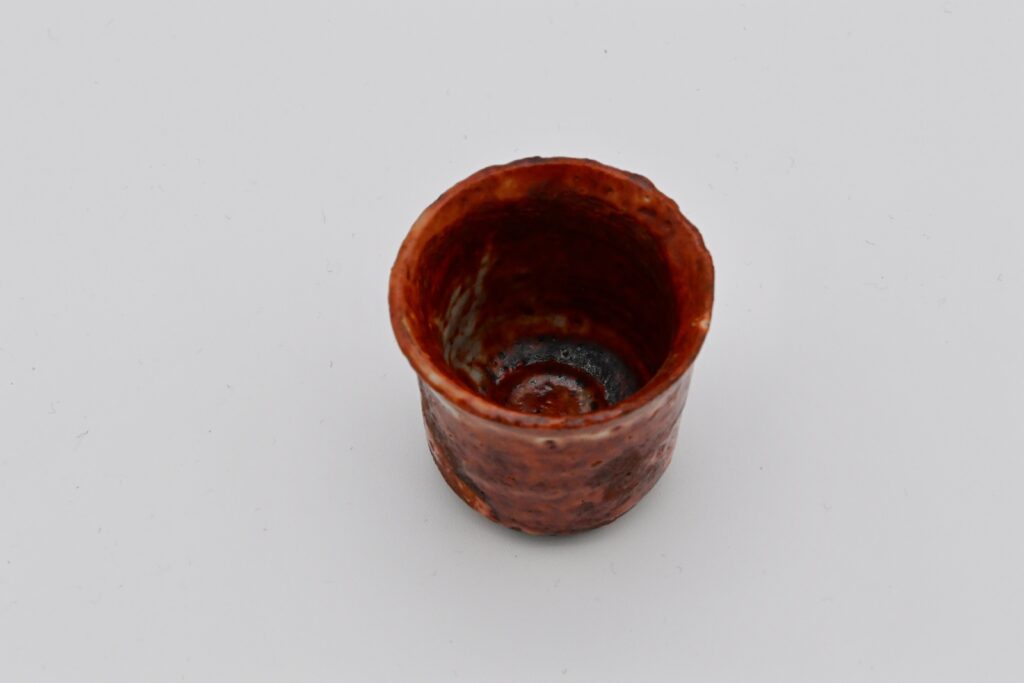 赤志野草文ぐい呑は、魯山人最晩年の作品の中でも特に優れた一品である。志野焼の中でもこれほど鮮やかに赤く発色したものは極めて珍しく、その色彩の美しさは際立って いる。さらに、内側には草(芦)の文様が施されており、これは「抜き絵」の技法によって表現されている。釉の濃淡が生み出す奥行きと、絶妙なバランスで整えられた姿形、そして完成度の高い焼き上がり(アガリ)は、どれを取っても一級品といえる。魯山人が到達した技と美 意識の結晶ともいえる貴重な作品である。