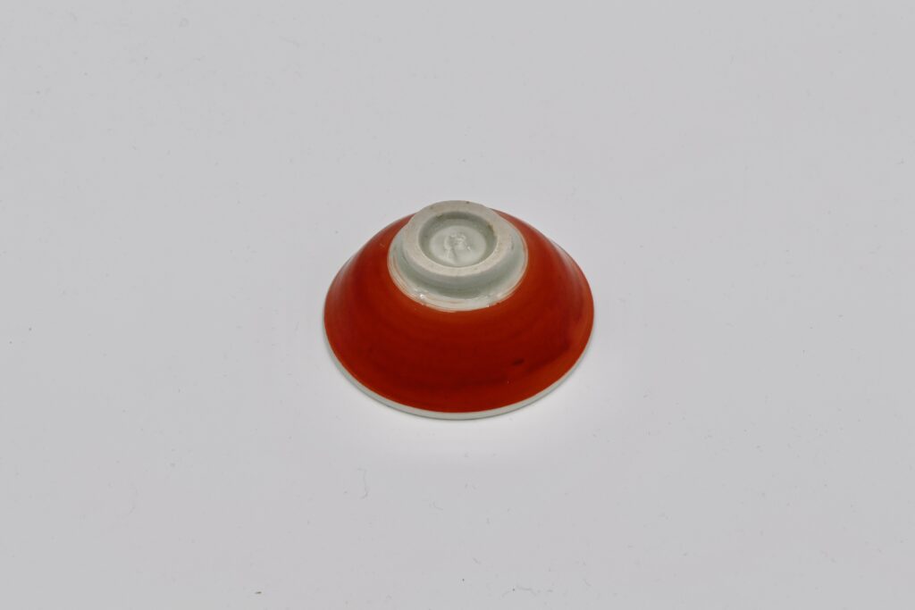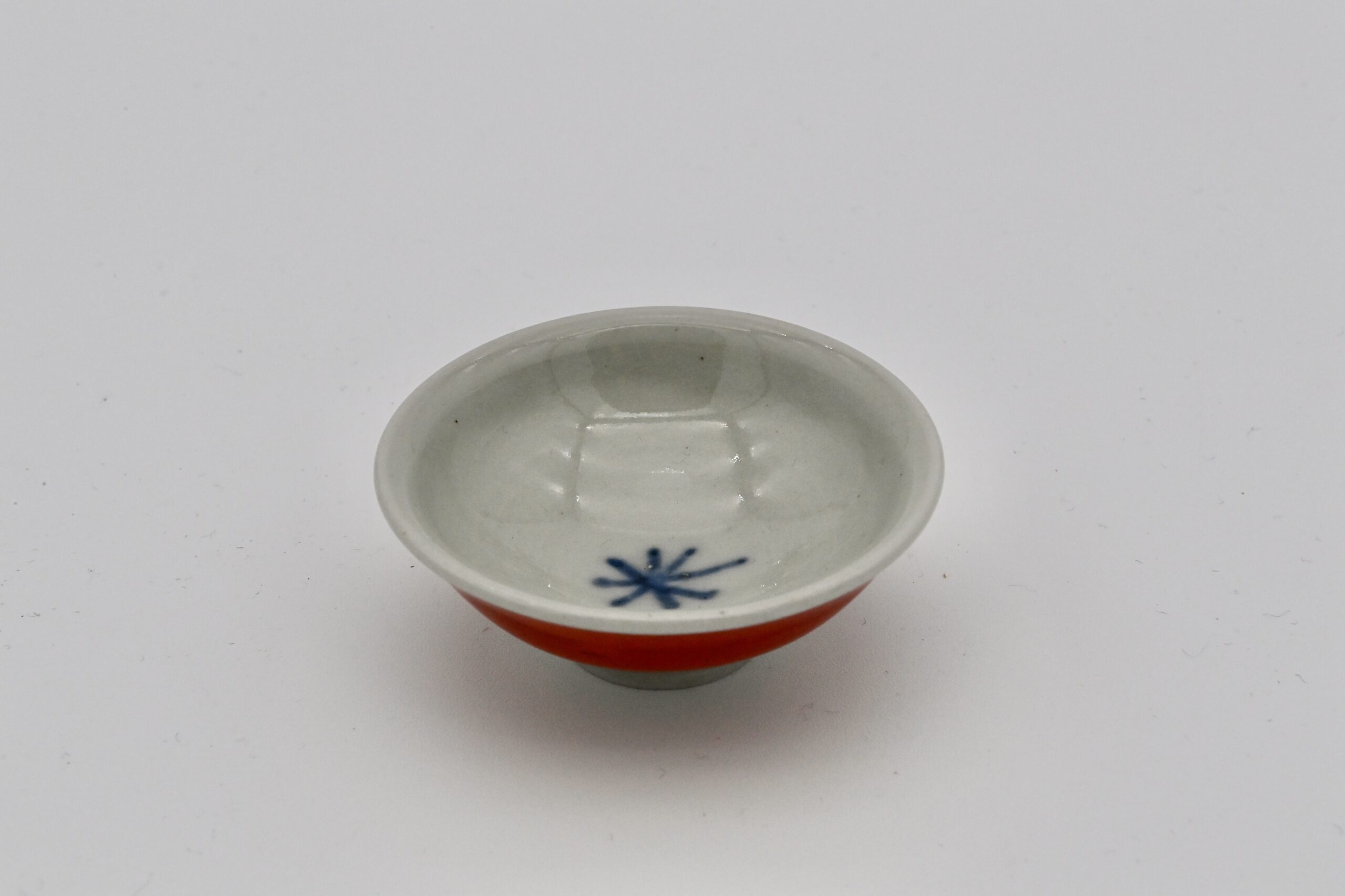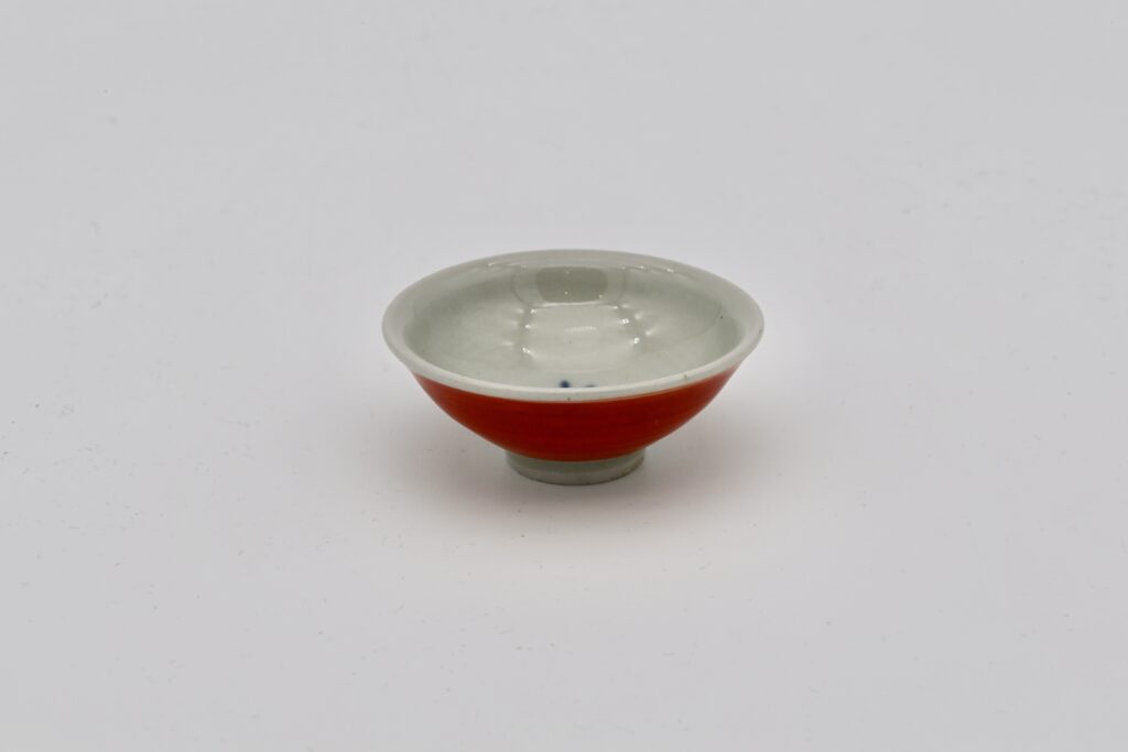 渋い赤がとても綺麗な酒呑です。中国嘉靖時代より400年もの間、これほど落ち着いた綺麗な赤呉須の色は、なかなか出すことは出来ませんでしたが、魯山人は茶渋を濾して混ぜる手法で、見事に素晴らしい落ち着いた色を出しています。