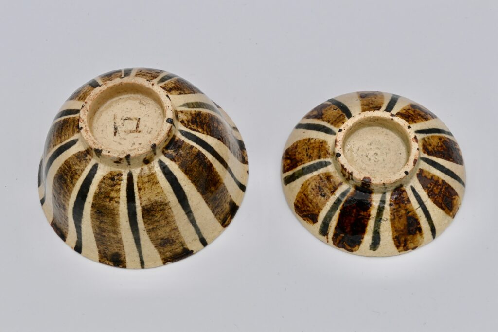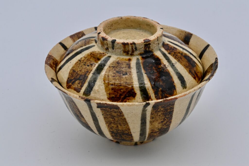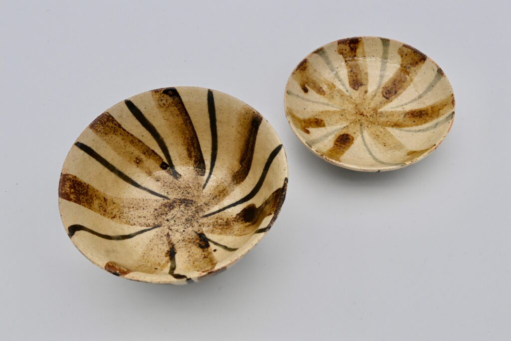 魯山人の飯碗で代表的な麦藁手。個々に違う表情を見せる仕上がりは魯山人ならではで、その時の感覚で絵付けをし、筆の流れが自然である。H8.2~8.9×W12cm 各高台内に描き銘「ロ」。