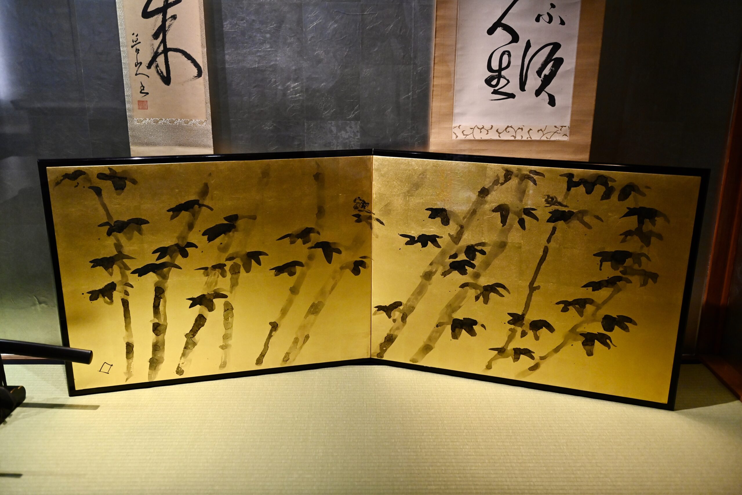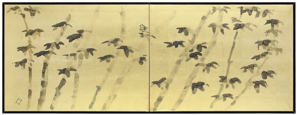 魯山人先生は陶芸だけではなく、「空間」を作り上げることにも力を注ぎました。扁額や書軸、行灯、ランプ、そして本作のような屏風も、作品としてだけでなく、置かれる空間も含めて先生の芸術世界の対象でした。二曲の屏風は金地の全面に竹林と、中央と右側(第一扇)に雌雄でしょうか、互いに見つめ合う鳥が描かれています。中央の鳥が振り向く様が愛らしいです。竹林は得意とした「たらし込み」の技法で濃淡を巧みに描き分け、間に吹く風や笹の擦れ合う音まで聞こえてくるようです。第二扇、左下に「ロ」の描銘。所載:「美食もてなしの芸術 北大路魯山人展」東京都庭園美術館他 1996年