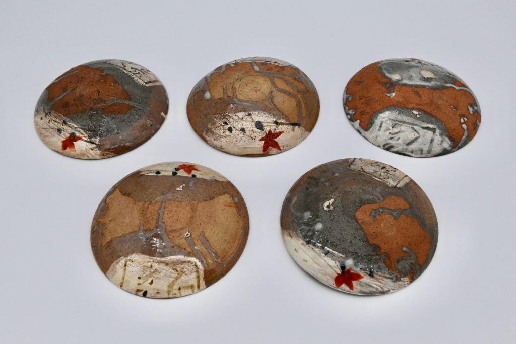 丸い平皿に吹寄(木の葉、紅葉、松葉)がデザインされたもの。土味も赤みを帯びたものと灰色がかったものが混ざっている。葉の色も青、透明感のある緑とそれぞれ異なり、小さな紅葉の赤がアクセントとなっていて目に楽しい珍しい意匠。皿の裏に白く枠取りをし、魯山人のサインが自由な筆致で施されているのも洒落ています。非常に珍しく、貴重な作品になります。
