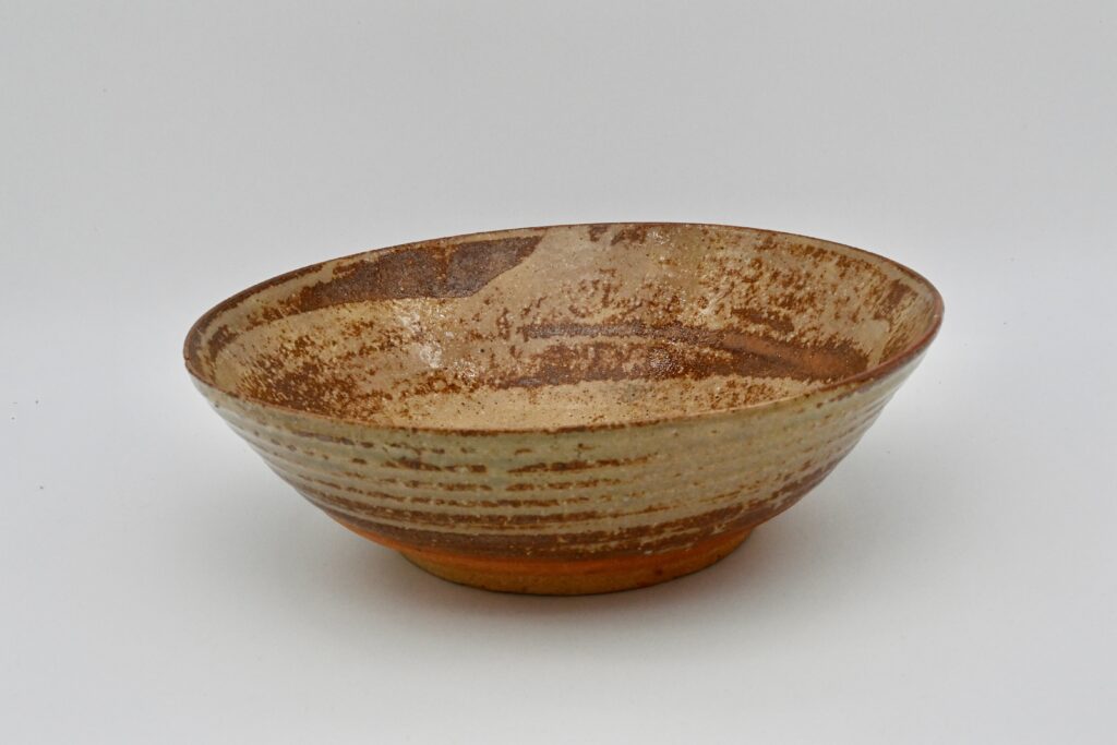 魯山人が自らの料理店「星岡茶寮」にて、料理と器との理想的な調和を求めて試行錯誤を重ねていた時期に生まれたものと考えられる逸品。料理を引き立てる実用性を備えつつ、飾り鉢としての存在感も兼ね備えた造形は、用途を 超えた美を感じさせる。そして最大の見どころは、金彩で描かれたあやめ文様。魯山人は銀彩を多用することで知られているが、金彩の作品は極めて少なく、本作のようにあやめの花を金彩で表現したものは、まさに希少中の希少といえる。 静謐な器面に浮かび上がるあやめの金が、華やかさと気品を湛え、魯山人の“美の挑戦”を今に伝えている。