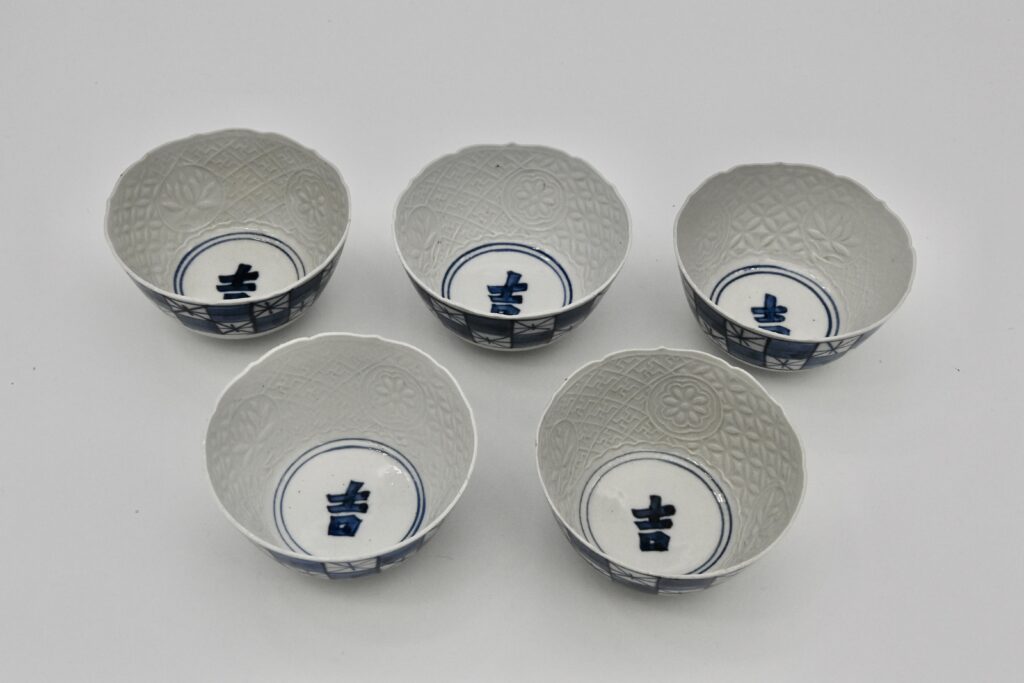 制作年不詳ですが、初期頃に制作されたと思われる。魯山人の磁器作品の中でも類を見ることがない希少価値のある作品です。口縁を輪花形に成形し、内部を押型で花弁や七宝の陽刻文としたもの。外側の染付は呉須と線描による市松紋様で、余白に米字を配しています。見込みの吉字が吉祥を表し、見どころの多い豪華な作風。図鑑 北大路魯山人の食器 黒田和哉著 光芸出版発行(1990年)P134に類品掲載。