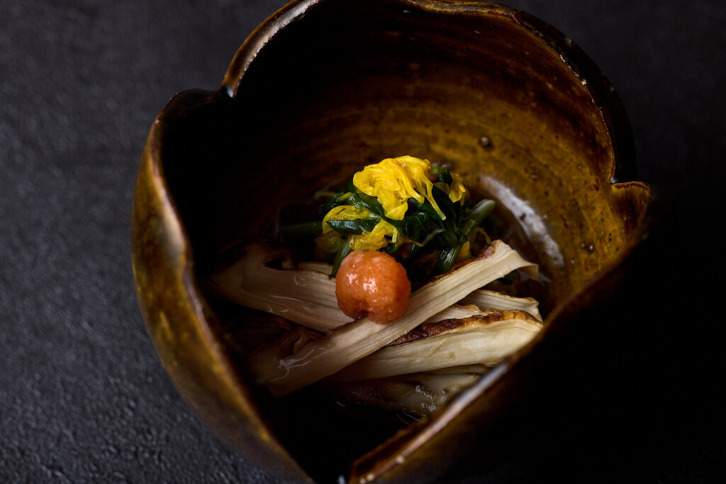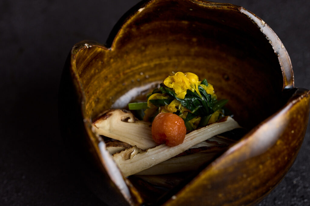 制作年不詳。つやのある落ち着いた飴釉を透かして、ろくろ目がさりげないアクセントとなっている割山椒の向付です。全体に窯傷を金繕いした箇所や、やや使用感が見られますが、さまざまなお料理にご活用いただける器です。高台脇には「魯」の丸印が捺されています。