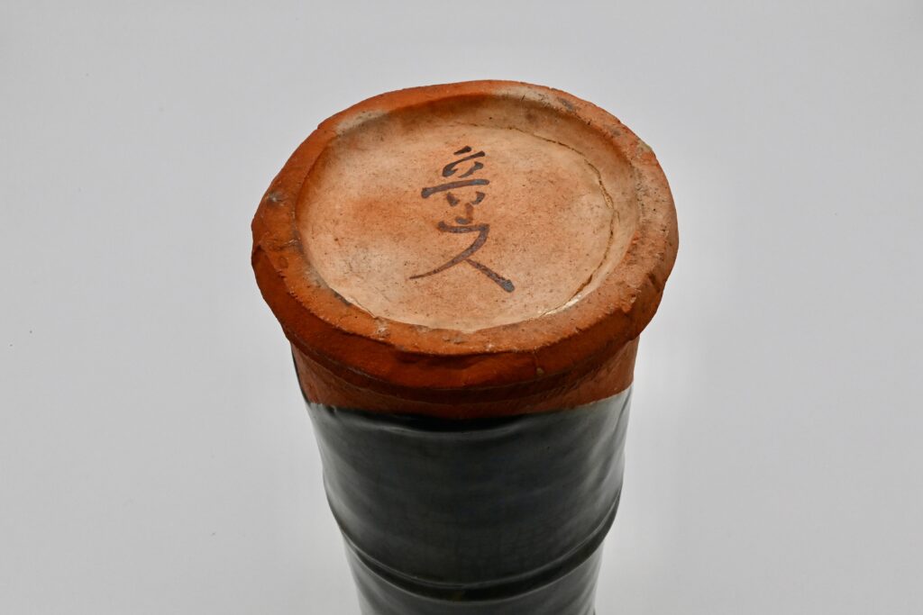 魯山人が多く手がけた竹形花入の中でも、織部釉によって仕上げられたきわめて希 少な一作である。竹形花入において織部釉の作品は全体のわずか数パーセントにとどまり、その中でも本作は、三種のサイズ展開のうち最も大きな“大”サイズにあたる堂々たる佇まいを誇る。 床の間に据えることで空間に深みを与える一方で、日常の中でも自然に花を受け止める柔軟さを併せ持つ。 実用される機会が多いため、花入には使用に伴う疵が見られることが少なくないが、本作は 無傷完品の状態で現存していることも特筆すべき点である。 実用と鑑賞、両面において優れた魯山人の花入の中でも、特に希少性と完成度の高い一品といえる。
