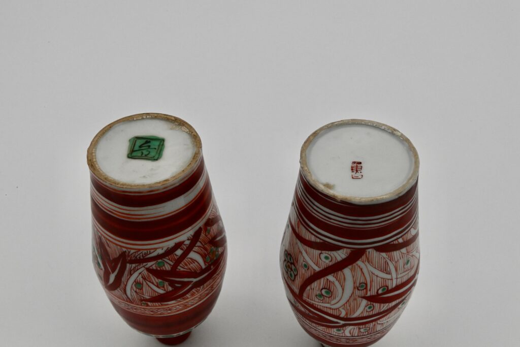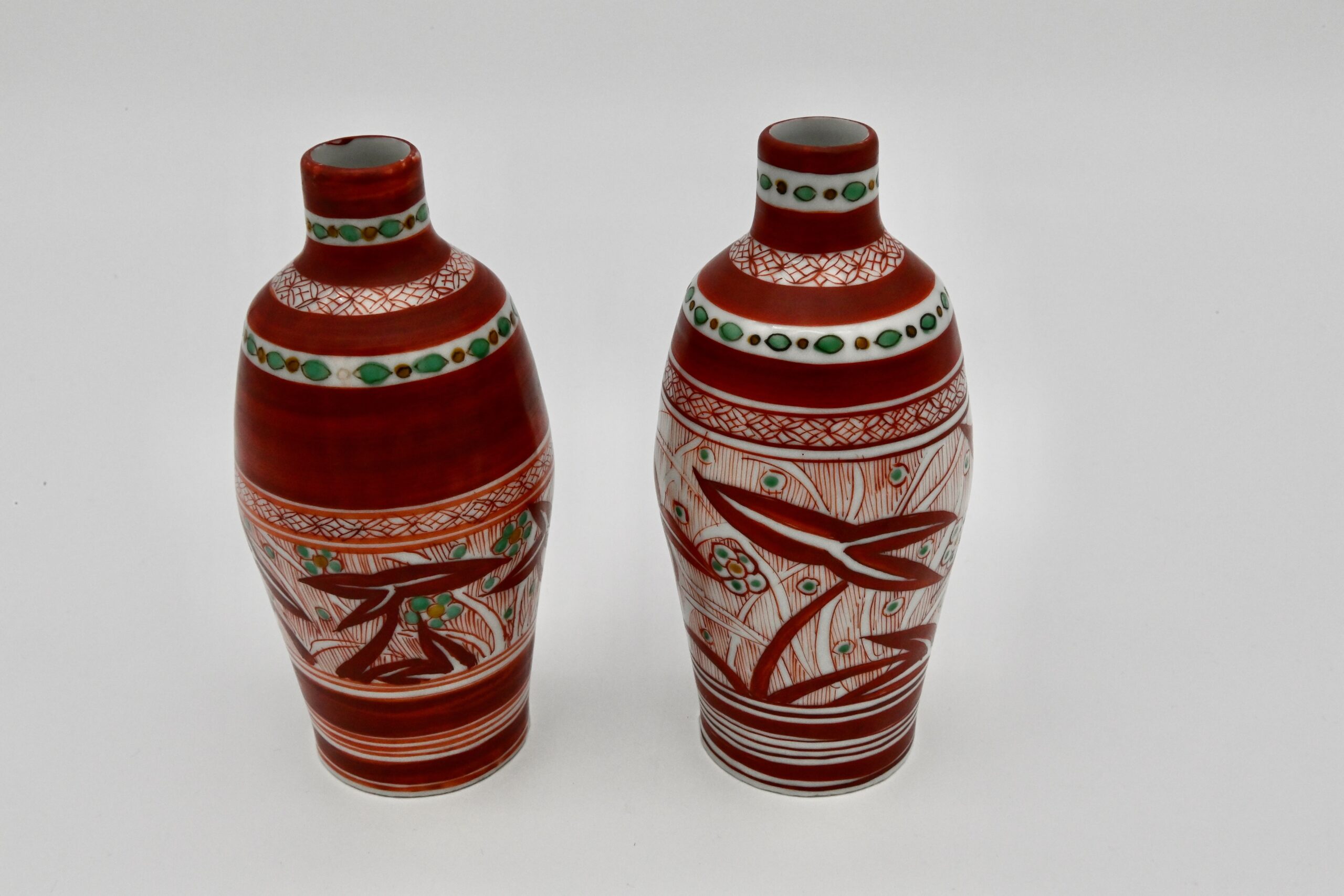 一対の徳利の中ではその描き込と絵の調子から王様と言われるものです。上の方は丸文繋を緑釉と赤絵で表し、その間の細かな七宝の繋ぎは赤絵で描いています。主題である沢瀉文は生き生きとしてまるで一対であることを喜んでいるかのようです。描銘も片方には赤絵で、もう片方には緑釉と黒釉などを用いて書いています。昭和20年ごろの作品です。9.2/H10.5㎝