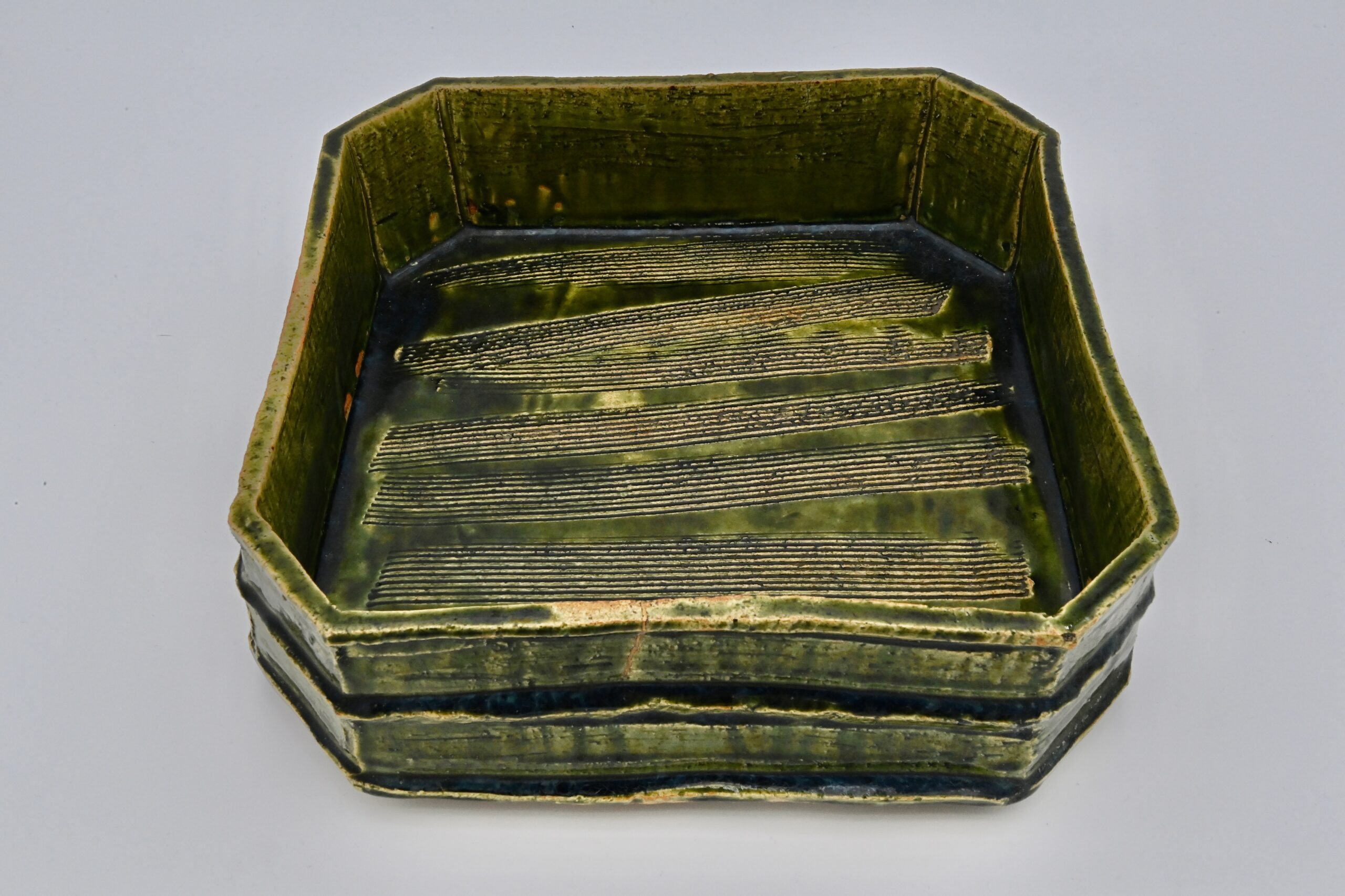 昭和17年に日本橋高島屋にて開催された第壹回工藝展覽會に出展した作品です。魯山人先生がこうした工芸展に出展されることはとても珍しくかなりの自信作と思われます。この四方鉢はかなり彫塑的に制作されているのが特徴です。たたら成形で四方隅切として下部と中部と上部をそれぞれ少しだけ縁を外側に出しています。器の内側には力強く櫛目を入れています。美しい織部釉が底部を除き全体的に掛かっています。底部にはしっかりとした弓足を四方に付けています。底部に「魯山人」の刻銘があります。魯山人先生59歳の力作です。金直し有。29.2 / H9.5cm