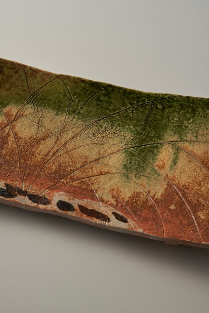 板皿に足をつけた俎板は魯山人の創意である。土見せ部分を地面に見立て、上部にいくほど織部釉が色濃くなる。まるで武蔵野の広さを思わせるように釘彫で草文が力強く彫られ、中央部には息をひそめてバッタが隠れている。料理の盛り付けを重視した魯山人による風情ある逸品である。高5.3×幅44.1×奥20.6 cm