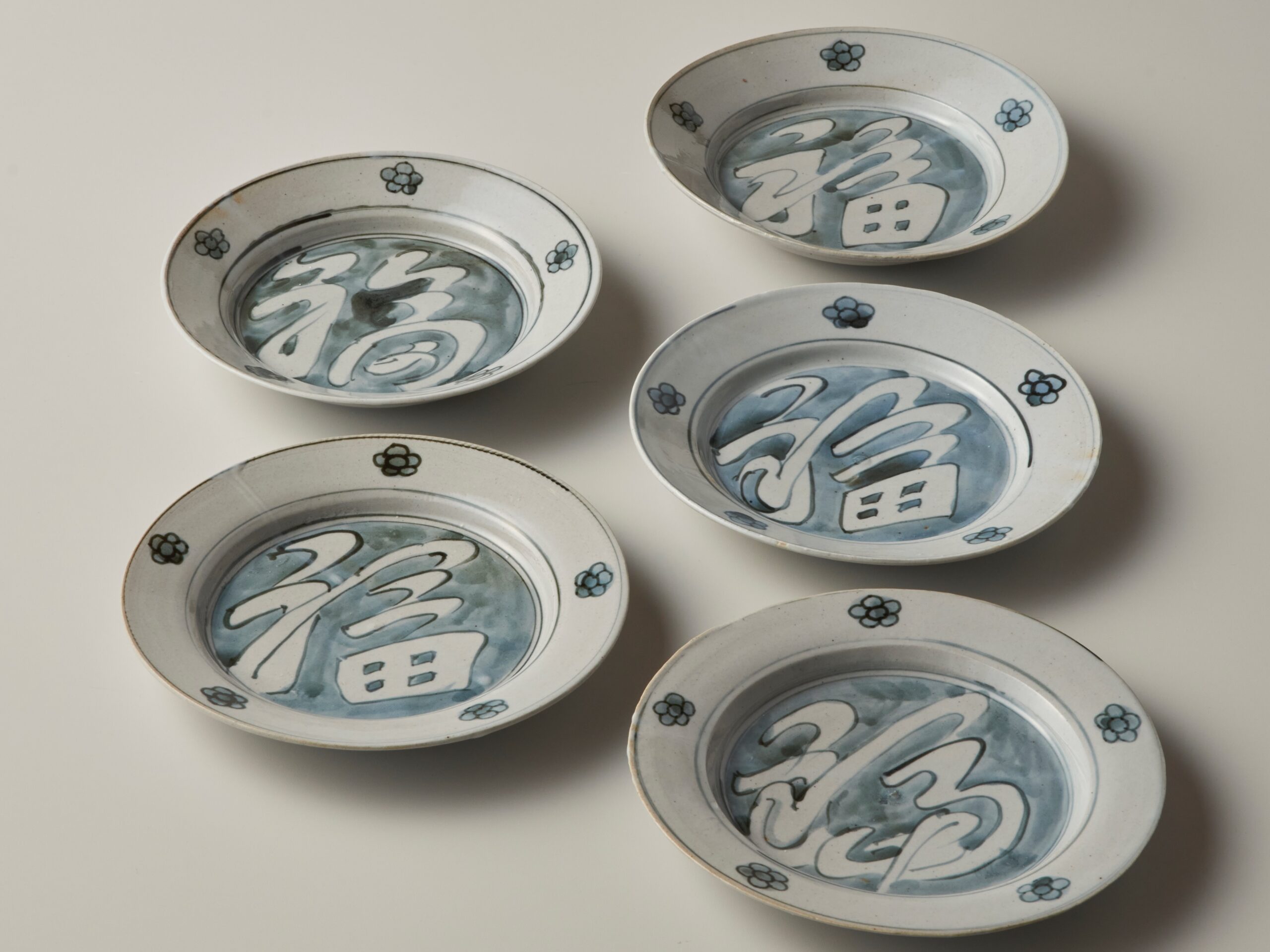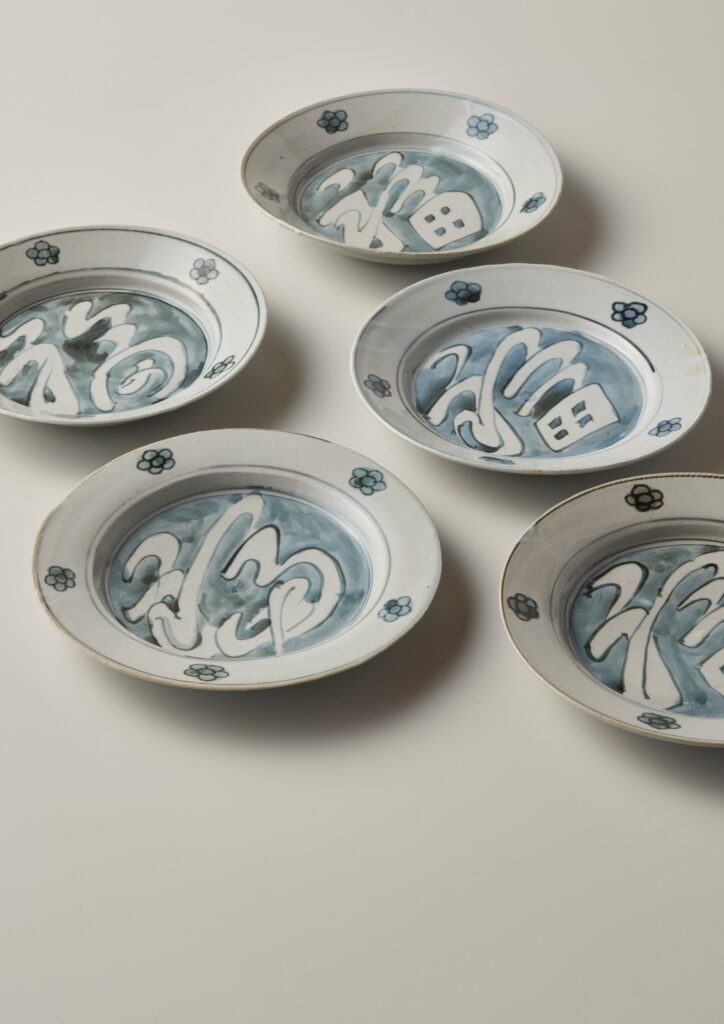 魯山人が得意とした籠字(文字の輪郭を書いてから中を埋める技法)の技法で、福字の周りを縁取り白抜きにしている。また、地を呉須で埋めることにより文字に立体感が生まれている。数多く作った福字皿とは違い本作品は初期に制作されており、縁に描かれた花文様と相まって味わい深く珍しい手である。高3.9×径18.6 cm