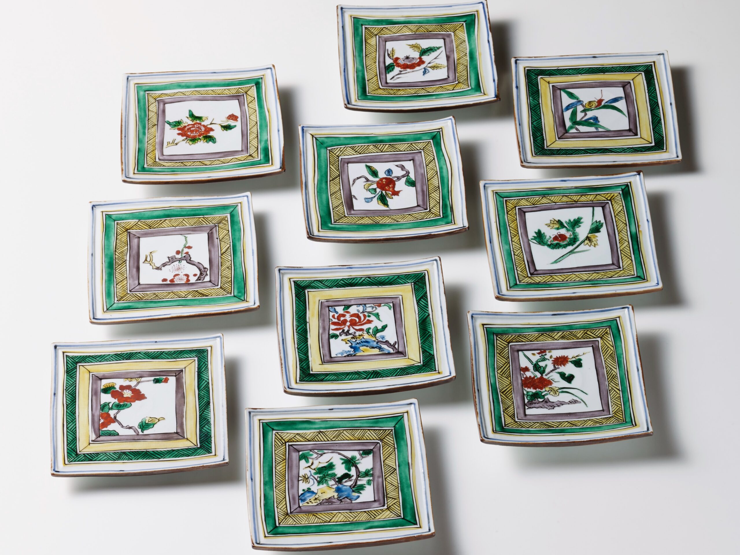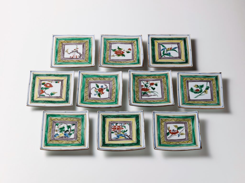 古九谷を模した作品で、中央に花鳥を配した。一枚一枚が精緻に描かれ、魯山人の画力の高さが伺える。古陶磁を蒐集し、それを糧にして自らの作品へと反映させた魯山人の逸品作であり、あまり類例のない希少な作品が当時のまま十枚揃っており大変貴重である。高3.0×幅15.2×奥15.2 cm
