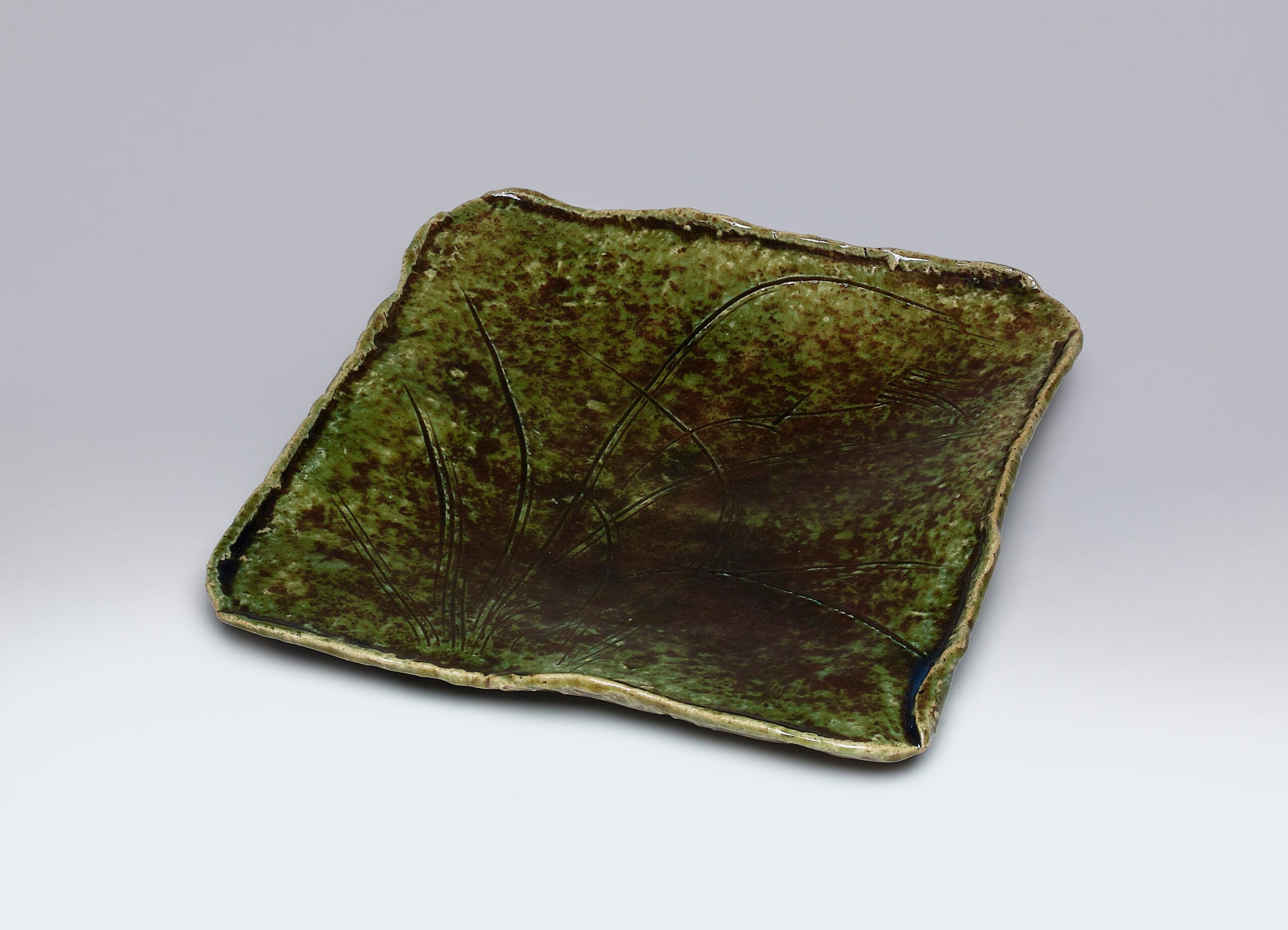 魯山人は1955年、翌56年と二回ほど人間国宝(織部)の指定を受けるが辞退している。それほどまでに魯山人が生み出す緑釉には深みがあって魅力がある。本作品はタタラ成形したあと口縁の土を立ち上がらせ、釘彫で迷いなく一気に線を引く。たっぷりと掛けられた織部釉により草文が瑞々しい。高5.2×幅28.0×奥28.5 cm