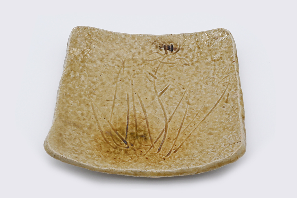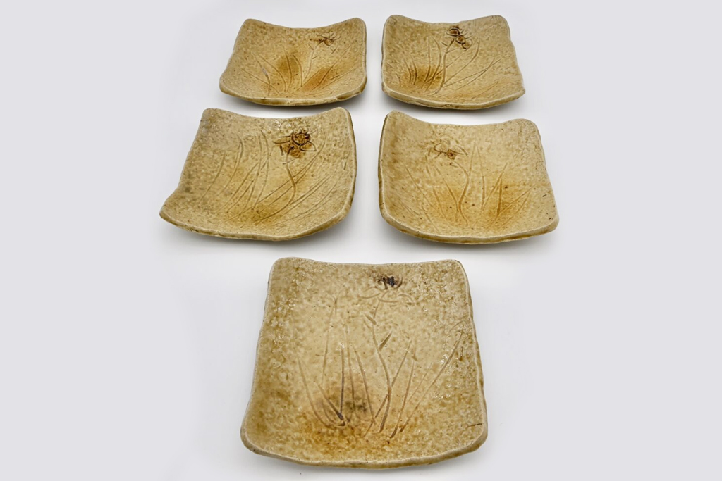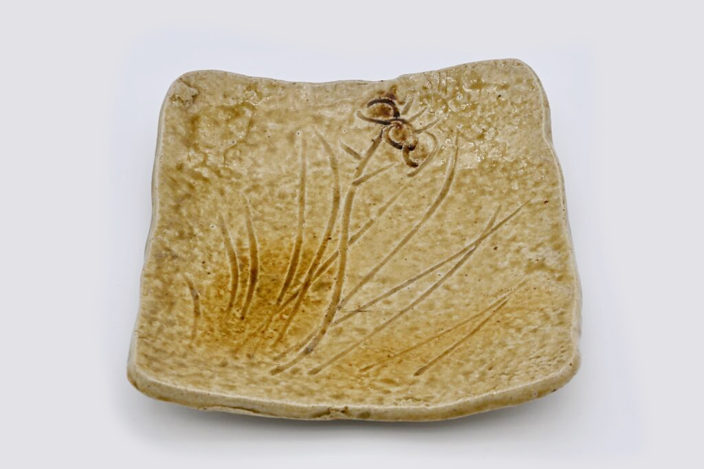 黄瀬戸は、構造上の問題と原料の調達が思うにまかせなかったので、その数は他の作品に比べて少ない。釘彫で菖蒲を描き、花は飴釉、葉のところは織部裕を施し、黄瀬戸釉を総掛けにした。全体的に淡く焼き上がり、それがかえって作品を効果的にした。この黄瀬戸の四方平鉢が五枚揃うとは貴重と思われる作品。