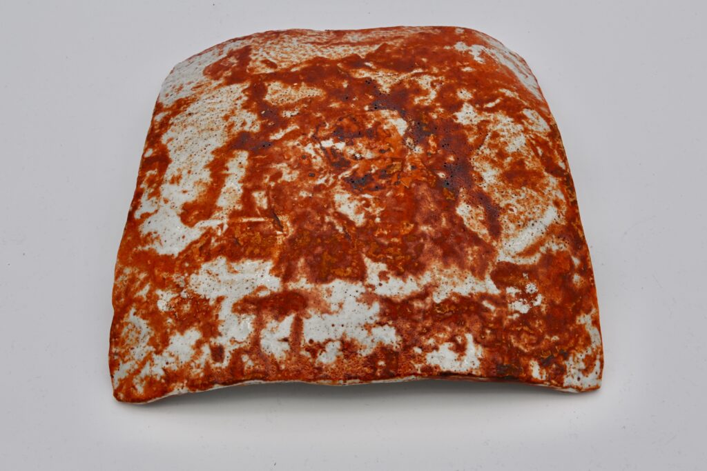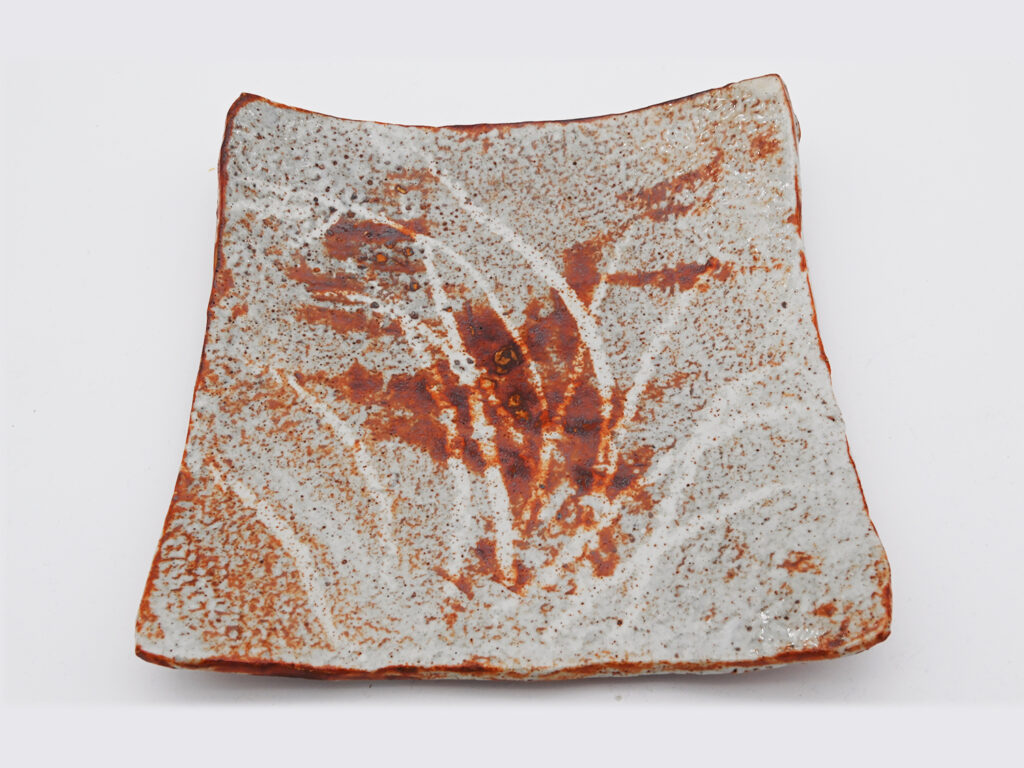 この志野作品は魯山人先生の晩年の作です。他の作家の志野作品が使うと汚れてしまうことが多いことからより高い温度で焼成することにより使いやすさを追求いたしました。成形後に鬼板という鉄分の多いものを全体に施し、風になびいている草花文を掻き落とした後に長石釉を全体にかけています。形も平皿にならないように立体的、彫刻的に作っています。