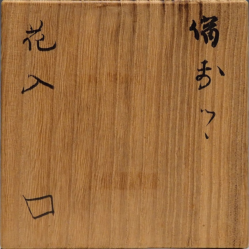 まるで古伊賀の花入を思い起こさせる見事な備前作品です。端正な筒形をしたこの花入はいつもの魯山人の物のように桃山期でなく以前でも以後江戸でなく現代でもない、時代を超えて未来にまで受け継がれる作品に思えます。品の良い景色になるよう上手に薬を掛け思いどうりに焼き上げているようです。大きさが好く床の間テーブル等何処にでも合い、花を生けても邪魔せず何時でも使える、前田友斎の造った箱に入った最晩年の名作です。・昭和33年(1958)頃の作品