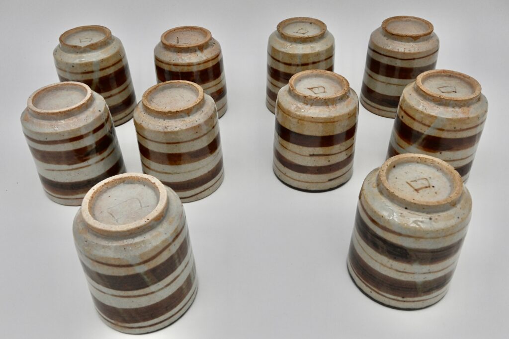 魯山人は有平模様や渦巻き等を湯呑みによく描きますが、とても洒落た感覚で躍動感があり、力強く引かれた線は眺めていて晴れやかな気分にしてくれます。この作品も、鉄絵で太く横にぐるぐると螺旋の筋を入れただけですが、素朴で邪魔をしないこの湯呑みは、厚手で熱いお湯を入れても持った時熱くならないのが特徴です。毎日使っても飽きの来ない身近に置く素晴しい作品となっています。・昭和26年(1951)頃の作品