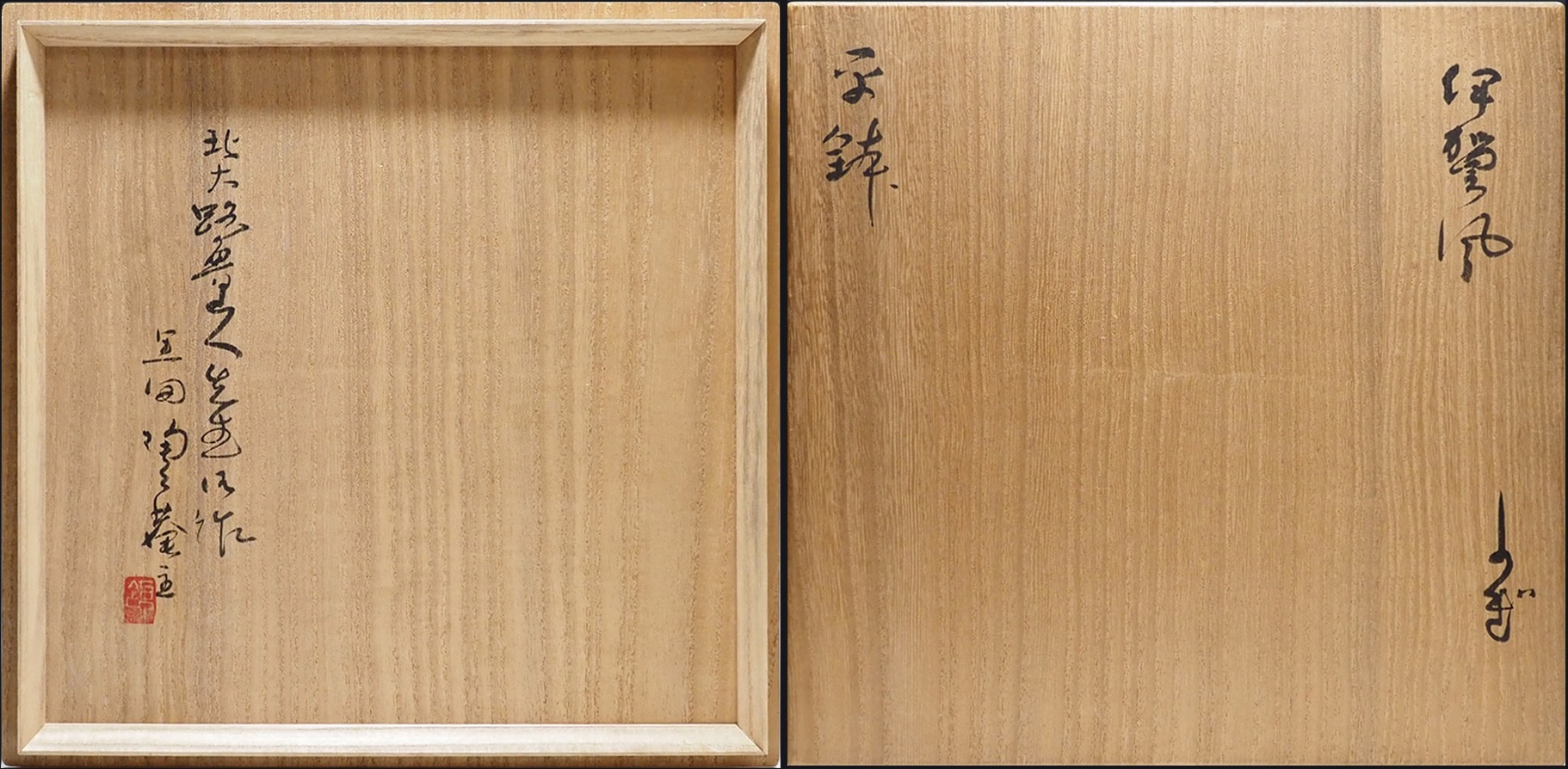 この四方皿も、魯山人独特の焼き物です。伊賀釉の濃淡が程よく出るように、蛤などの貝の縁を使って表面をしのぎ(削ぎ落とす)四方の淵を波打たせ、素敵な趣を出しています。魯山人らしい四方皿で、ビードロ(伊賀釉が厚く掛かり宝石の様に綺麗な緑色に発色する事)が品良く出て、素晴らしい焼き上がりになっています。何にでも使え、使い易い、いかにも魯山人らしさが出ている、心躍らせる最晩年に近い頃の名作です。・昭和32年(1957)頃の作品