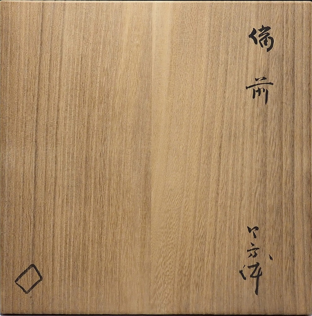 晩年の備前四方鉢です。昭和30年以降には、備前作品は徐々に、軽く固く、見た目に白いゴマ模様が多く出るようになりました。これも古備前等を自分自身で消化し更に良い(魯山人らしい)物を創る姿勢の表れでしょう。最晩年の作品には、ゴマが白く焼け、窯変が赤に見える、まるで、今までの備前と酸化(窯変)還元(白地に火襷)が入れ違ったような、素晴らしく胸躍る作品を創っています。この作品も、一枚単独で共箱にしてある、軽やかに焼きあがった魯山人備前の名作です。・昭和32年(1957)頃の作品