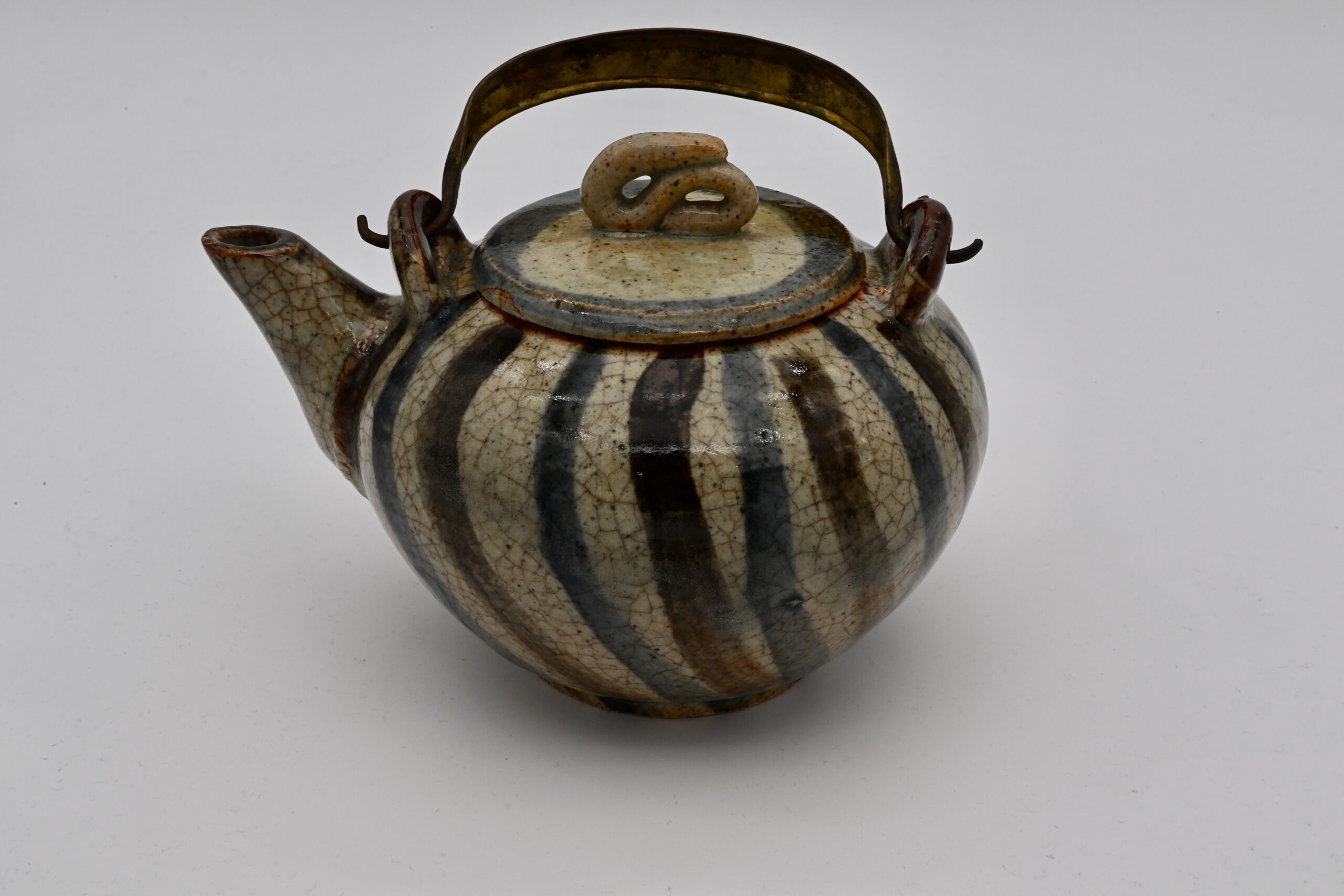 本作品は大胆に鉄絵と呉須で交互に太い斜線を風船のように描いています。一本一本の線に少しも躊躇もなく大らかな意匠となっています。昭和30年頃、晩年の作品です。