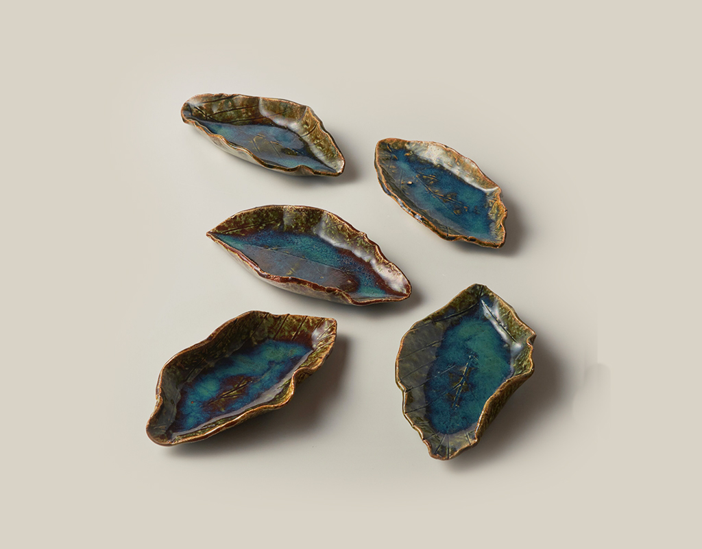 283.織部釉木乃葉形平向付五客(陶々庵識)