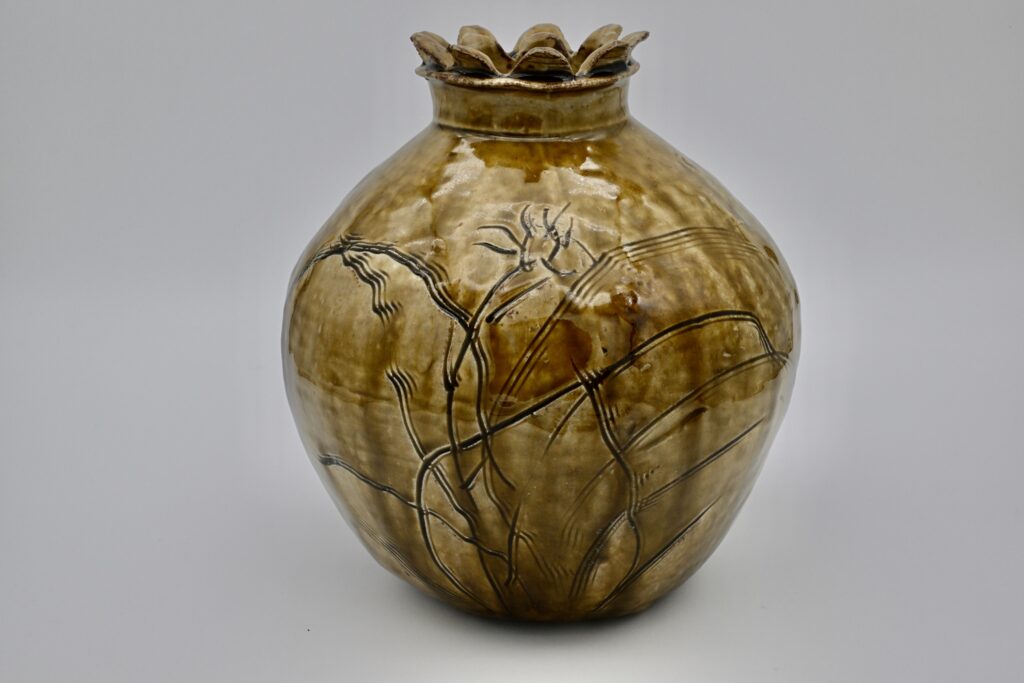 287.備前土草文櫛目彫破レ花生(陶々庵識)