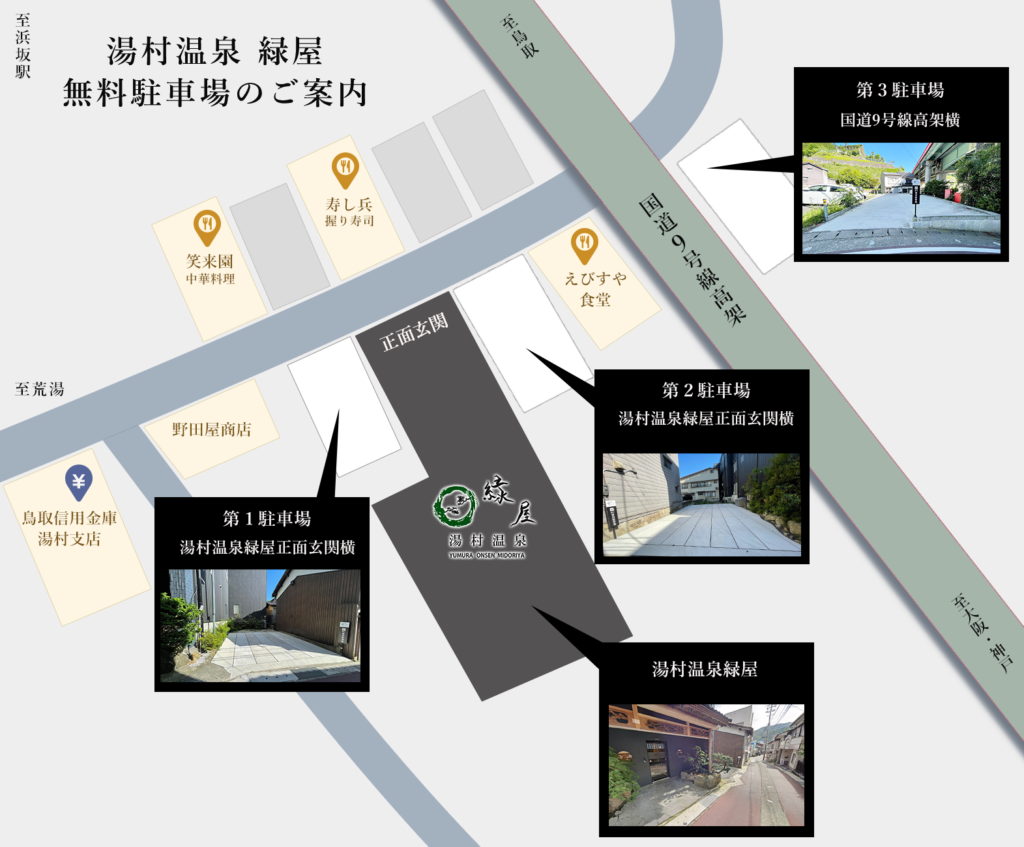 湯村温泉緑屋から徒歩1分、9号線高架横に第3駐車場がございます。