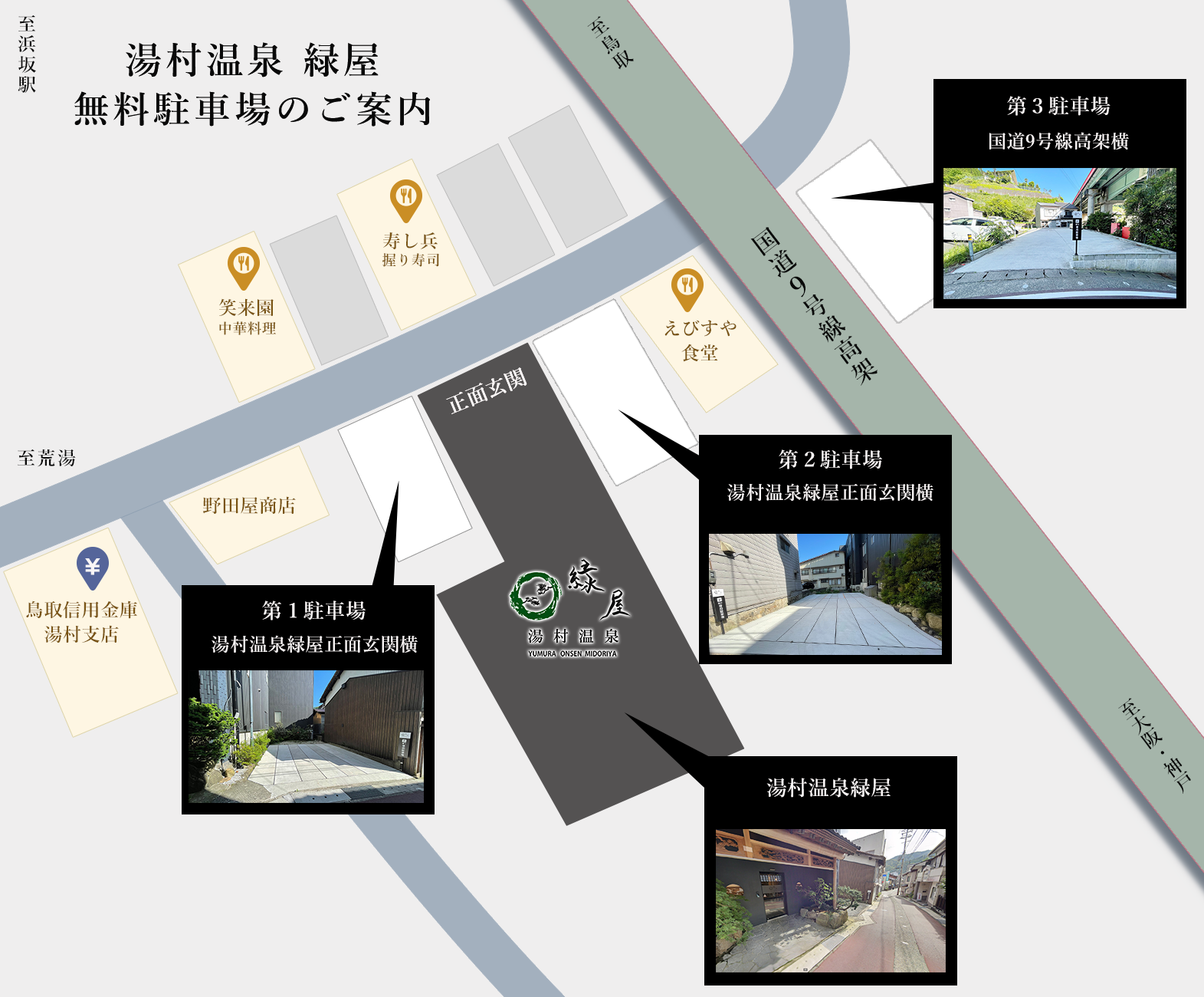 湯村温泉緑屋正面玄関横にございます。「えびすや食堂」様と緑屋の間の駐車場です。