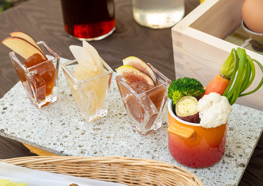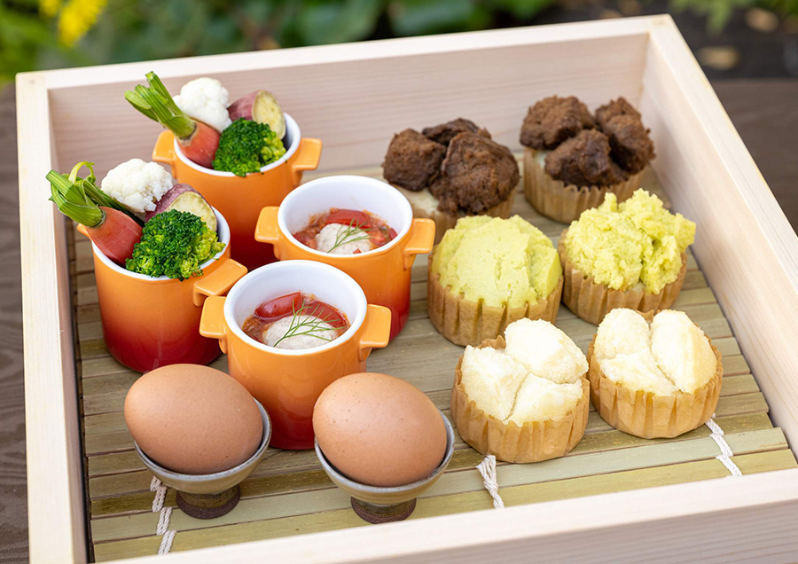 野菜のスープ、トマト煮込み、蒸し野菜、蒸しパン、特製ディップ 等