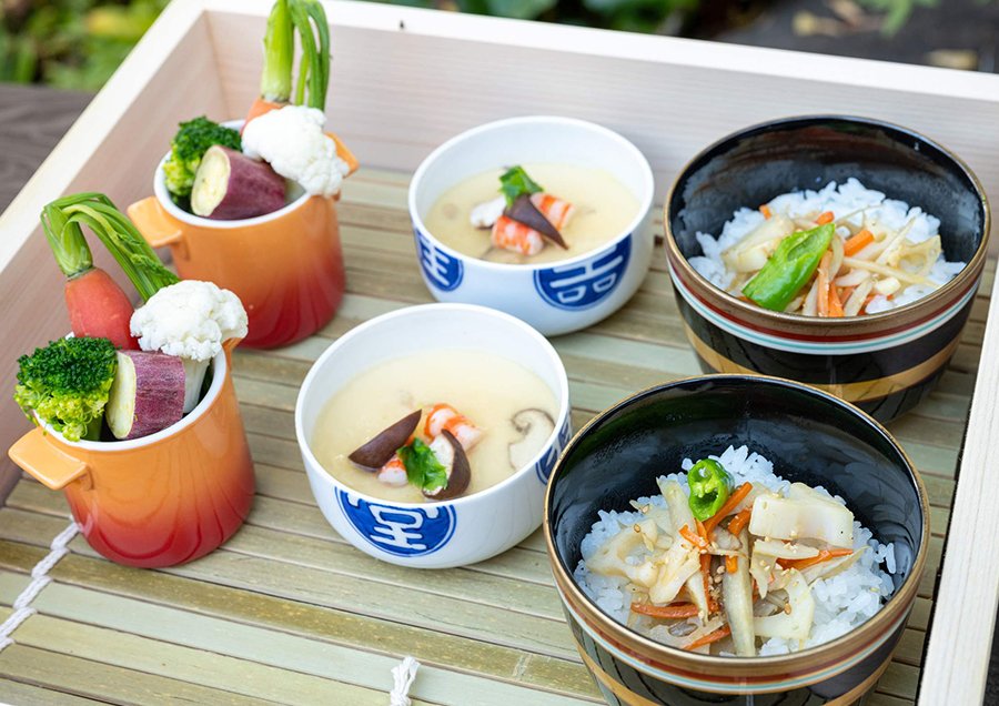 五目飯、茶わん蒸し、塩鮭、温泉卵、きのこ汁 等