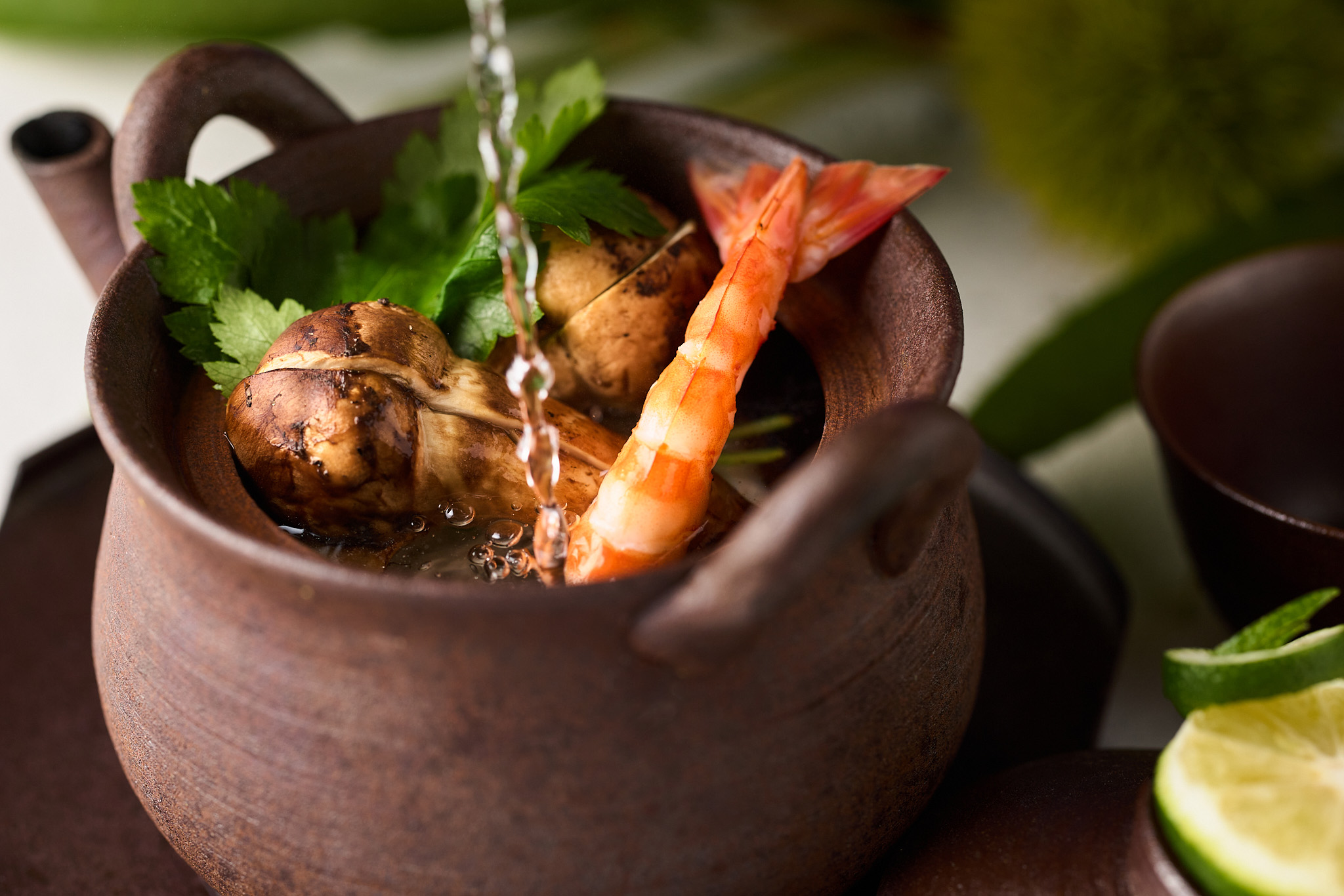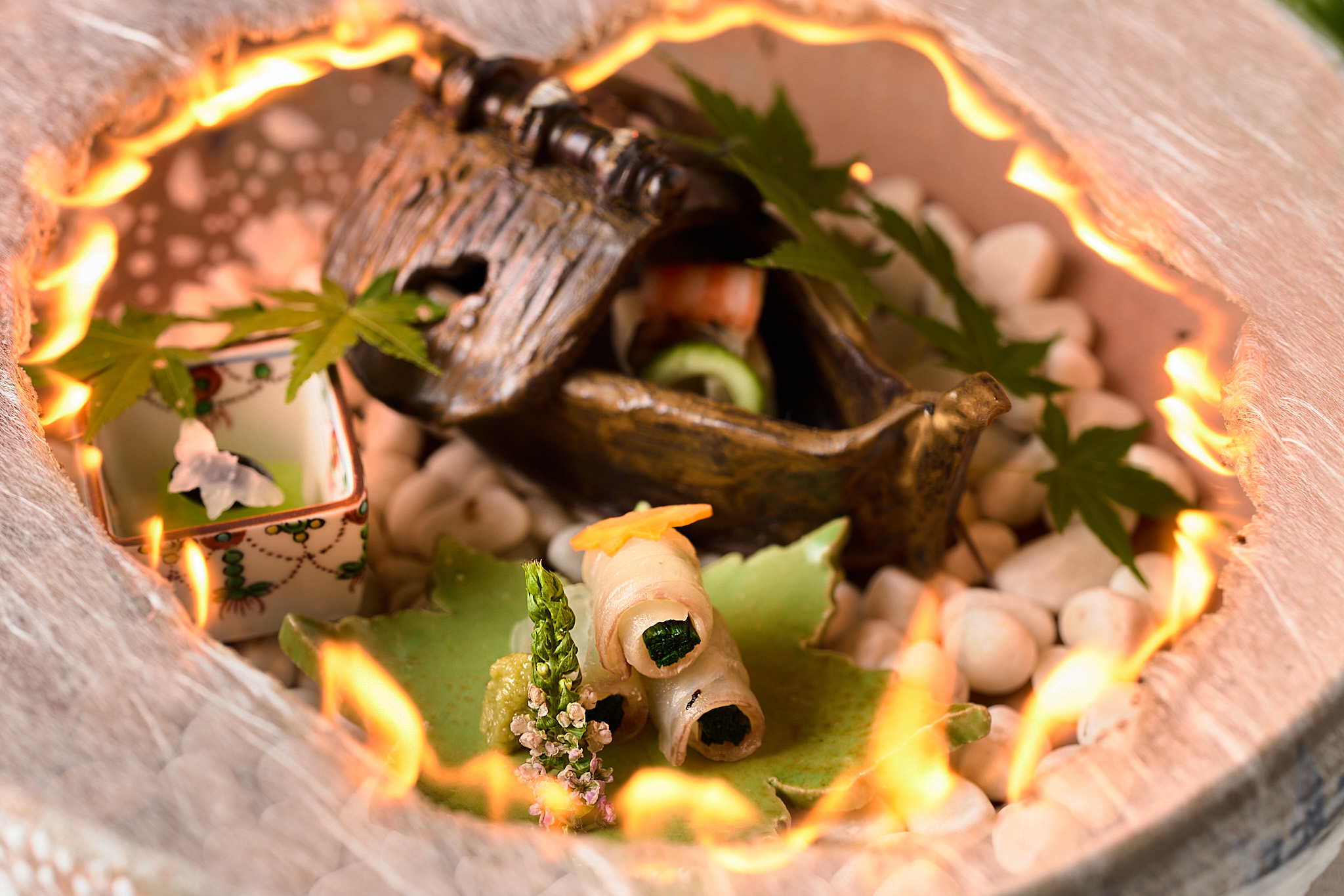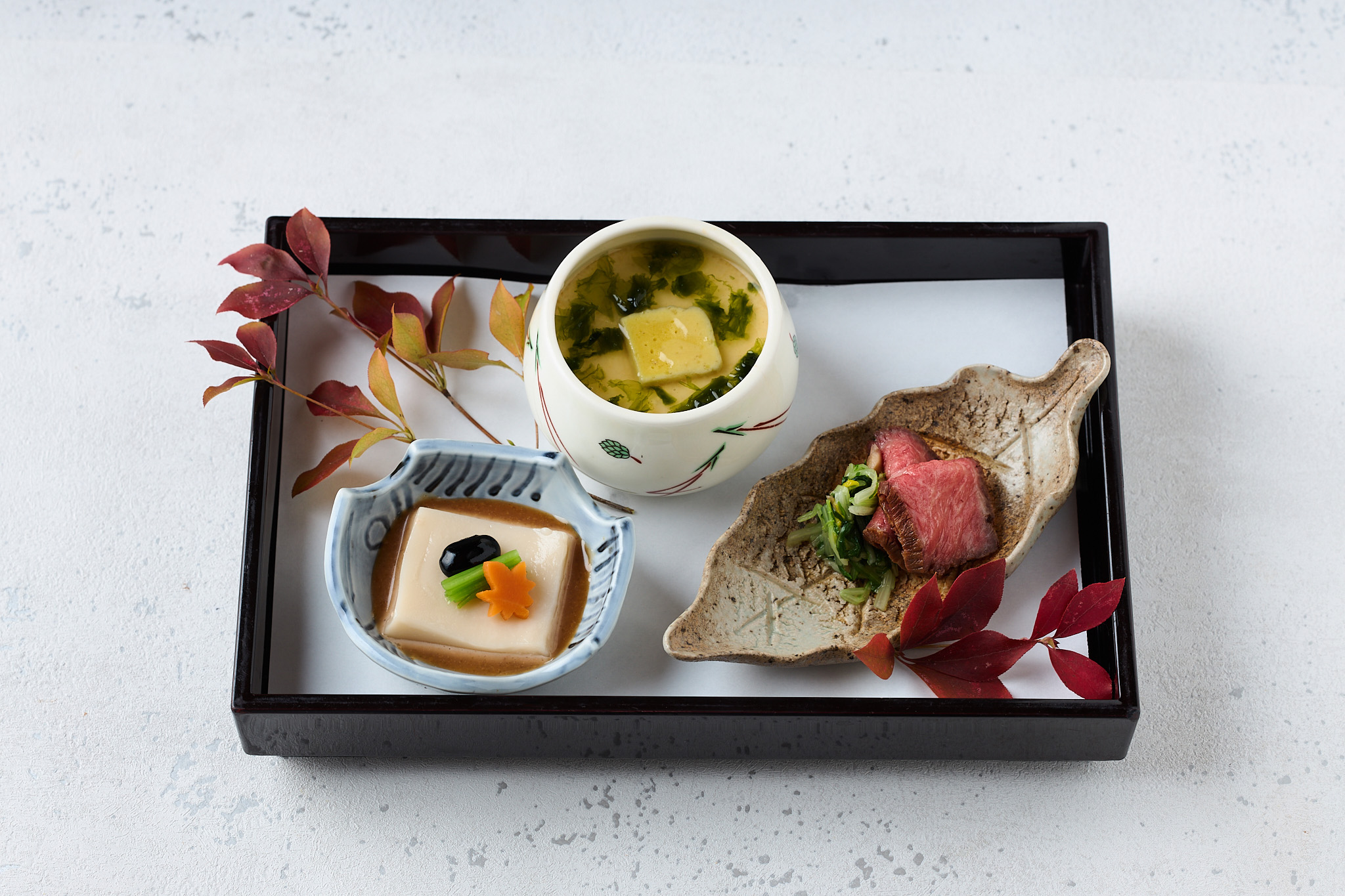 地元養父市のブランド八鹿豚(ようかとん)のしゃぶしゃぶは地場野菜、三尾のわかめと共にご堪能いただけます。当館特製のポン酢タレやレモン味でさっぱりとお召し上がりください。しめはうどんと朝倉山椒をご用意しております。