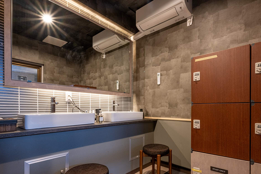 1階奥左側手前に位置する大浴場です。窓から石原和幸プロデュースの庭園をお楽しみいただけます。