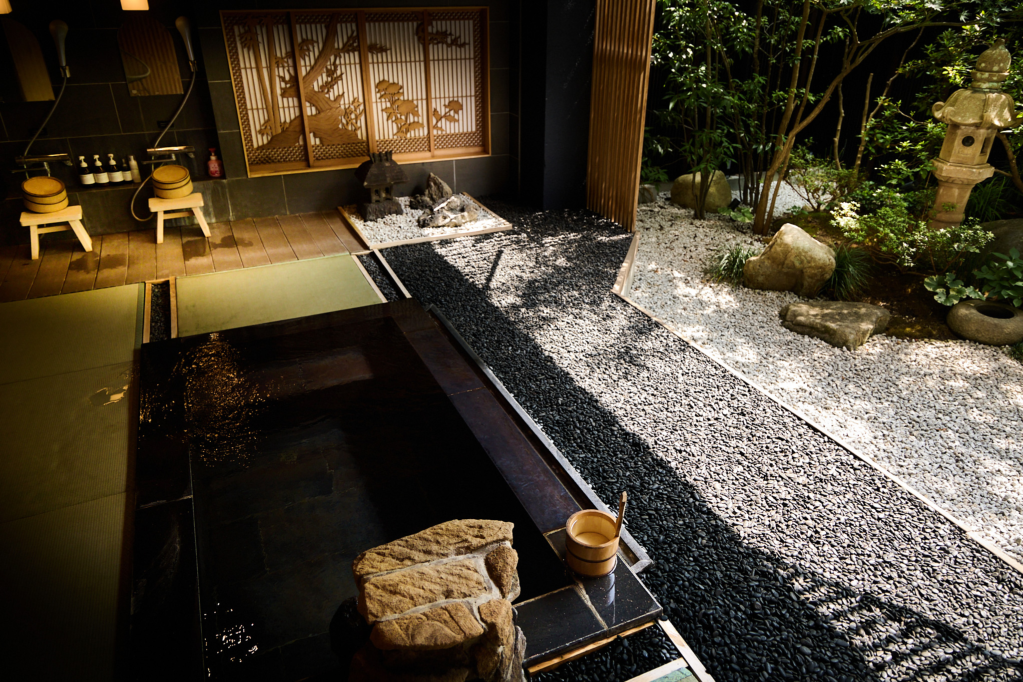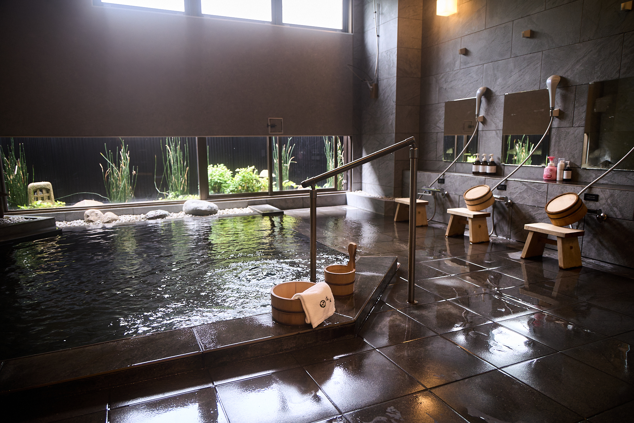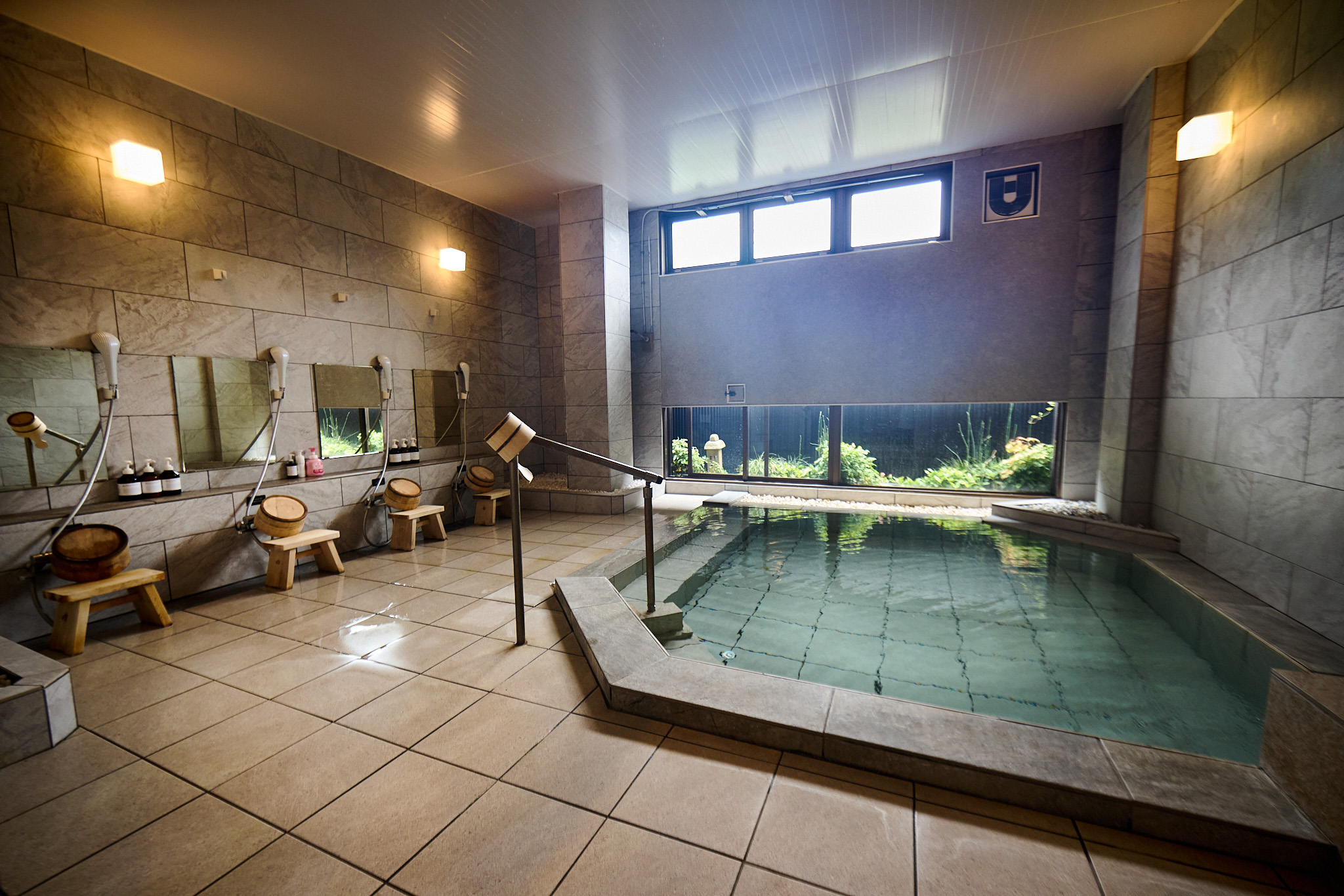1階奥左側奥に位置する大浴場です。窓から石原和幸プロデュースの庭園をお楽しみいただけます。