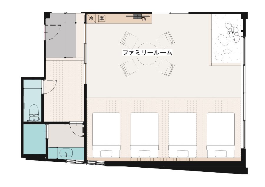 広々としたファミリールームは小さなお子さま連れやグループでのご旅行におすすめです。4台のベッドと広めの洋間スペースにはソファとテーブルをご用意しました。楽しいひと時をお過ごしください。