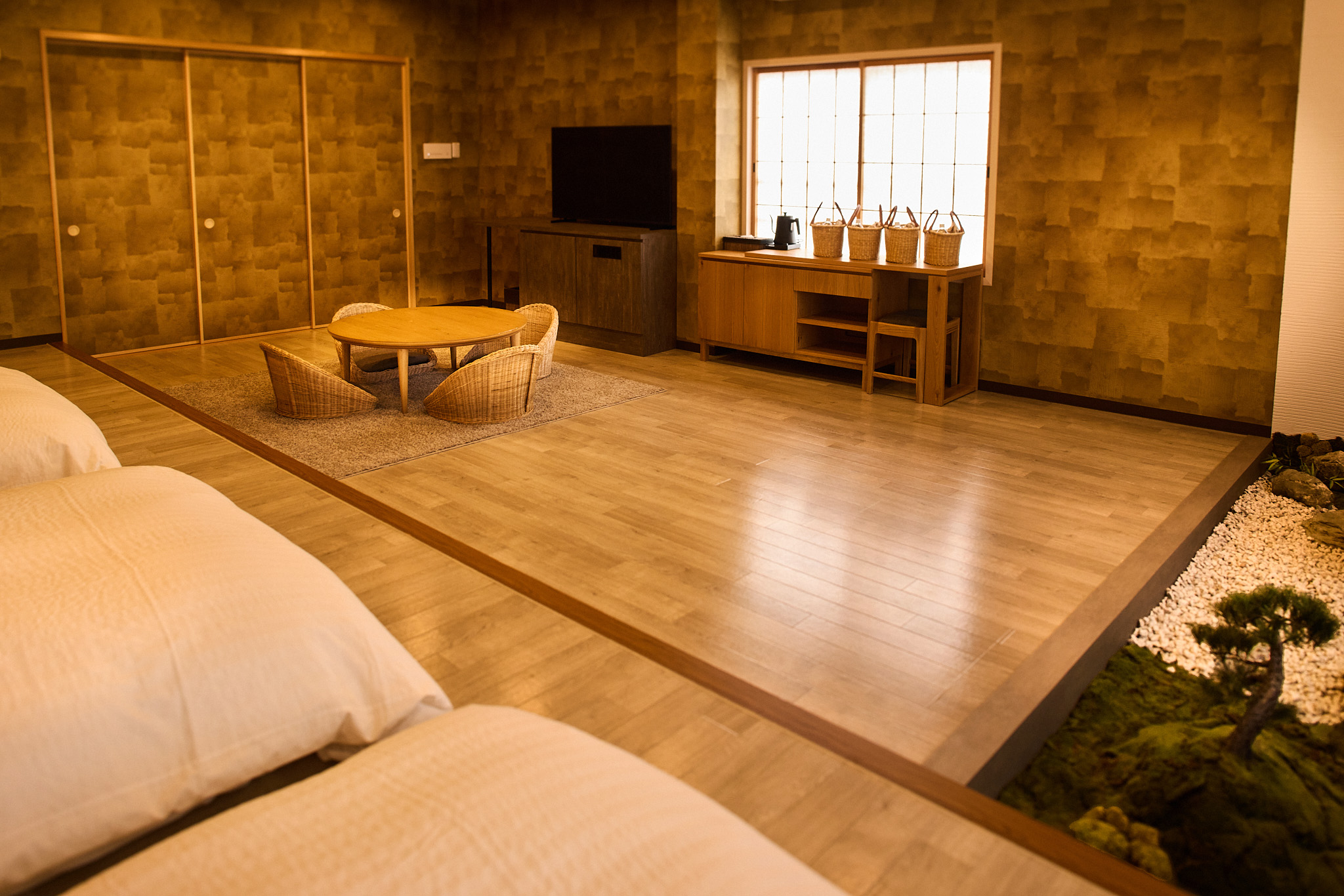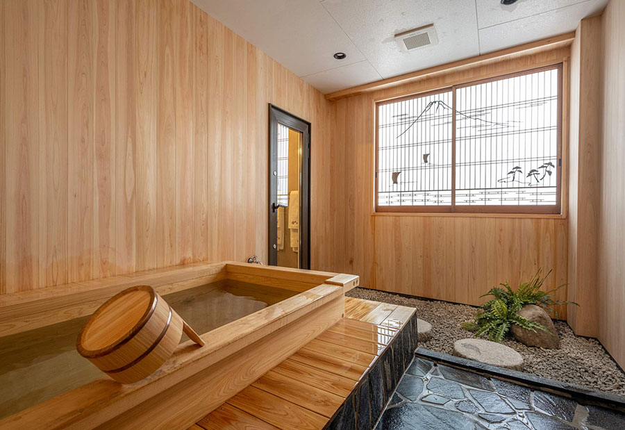 当館自慢の源泉掛け流し総檜風呂付のお部屋です。美人の湯として知られる温泉をお部屋でたっぷりとご堪能いただけます。ベッド4台と畳のスペースの広々としたお部屋は、ご家族やグループでのご宿泊に最適です。室内には世界的庭園デザイナー石原和幸プロデュースの庭園や緑を設置。緑溢れる空間で優雅な時間をお過ごしください。
