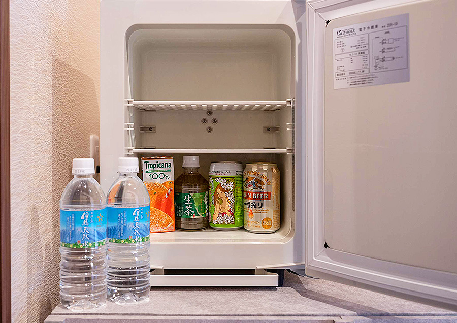 お部屋の冷蔵庫には、あらかじめ無料のお飲み物をご用意しております。通常のセット内容は ミネラルウォーター 、ソフトドリンク、ビール(缶) 、サワー(缶)となります。