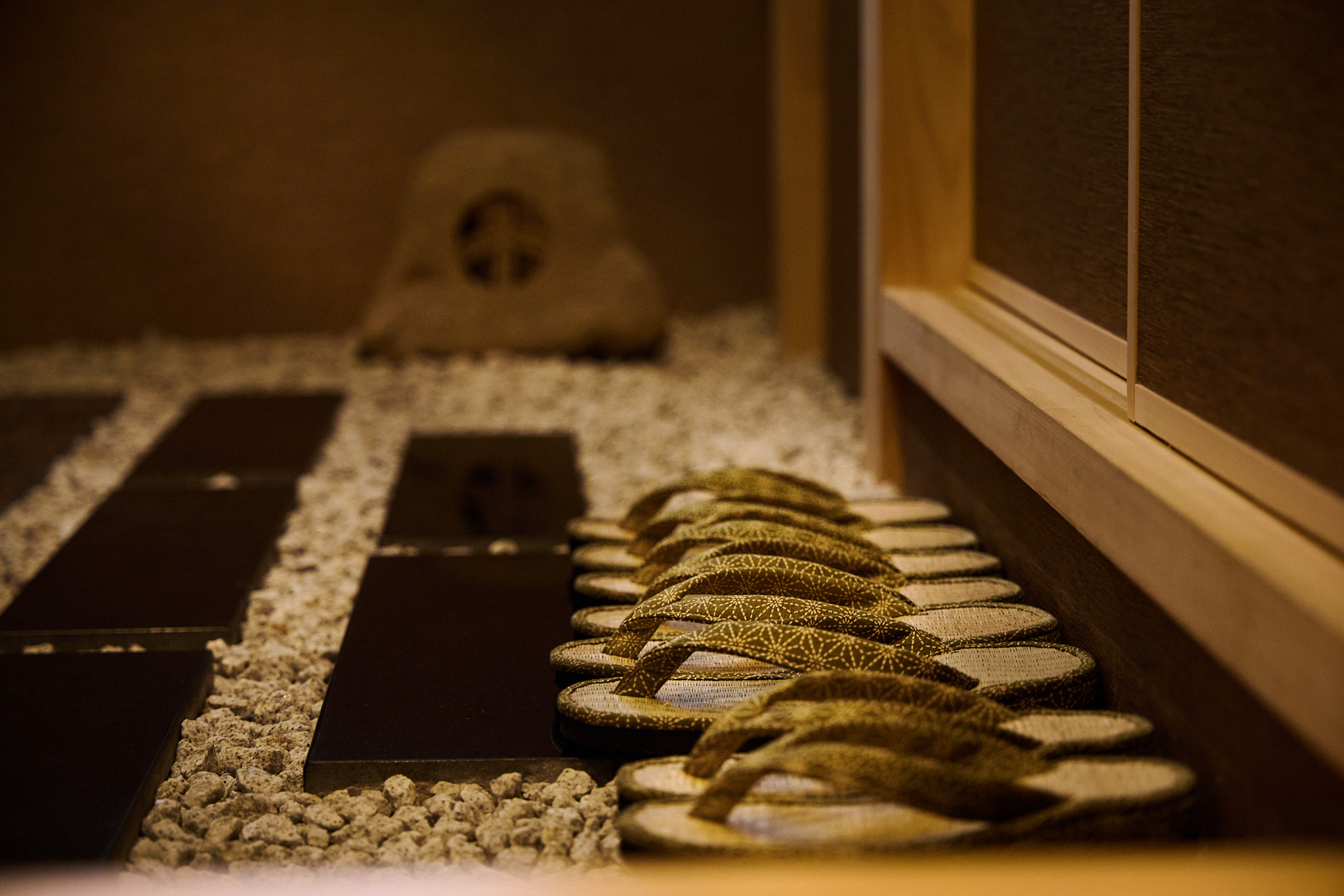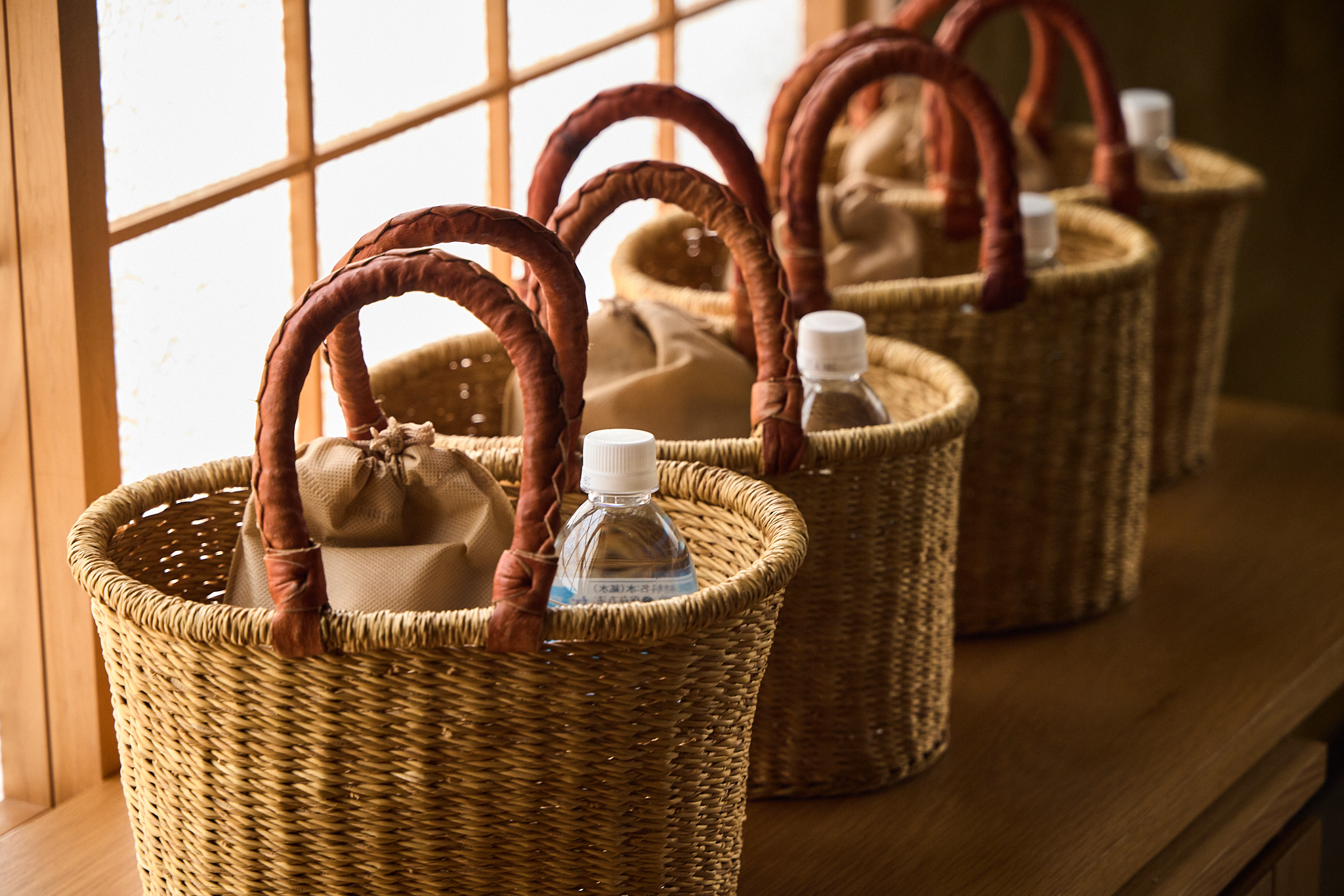 お部屋にかごバッグをご用意。雪駄、靴下、各種アメニティグッズをセットしております。
