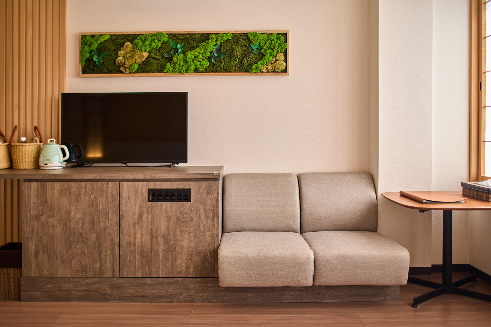 木の温もりあふれる和モダンな客室。全室無料Wi-Fi完備、自然素材を使ったこだわりの家具を揃えております。日常を離れごゆっくりとお寛ぎください。
